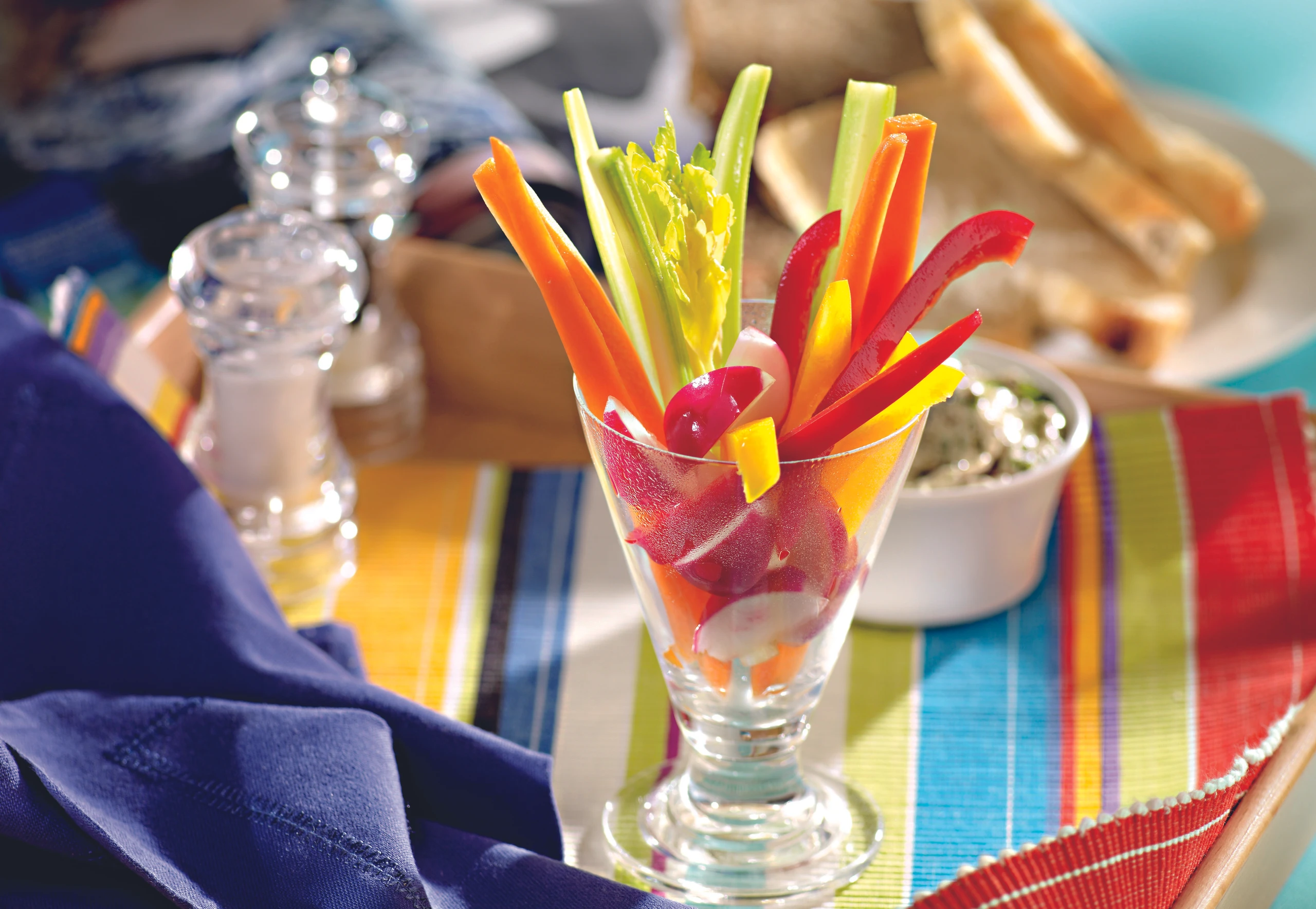 Karotten und Sellerie schälen. Paprika längs halbieren, waschen und die Kerne entfernen. Gemüse in dünne Stifte schneiden und in Gläsern anrichten. Radieschen putzen, waschen und in Spalten schneiden.