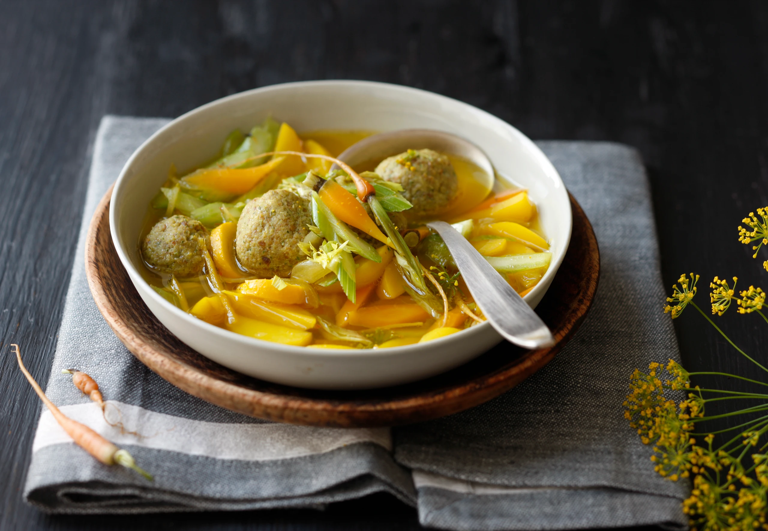Aus der Masse 12 Knödel formen, in die Suppe legen und ca. 10 Minuten köcheln. Suppe mit den Knödeln anrichten, mit Selleriegrün und Dillblüten garniert servieren.