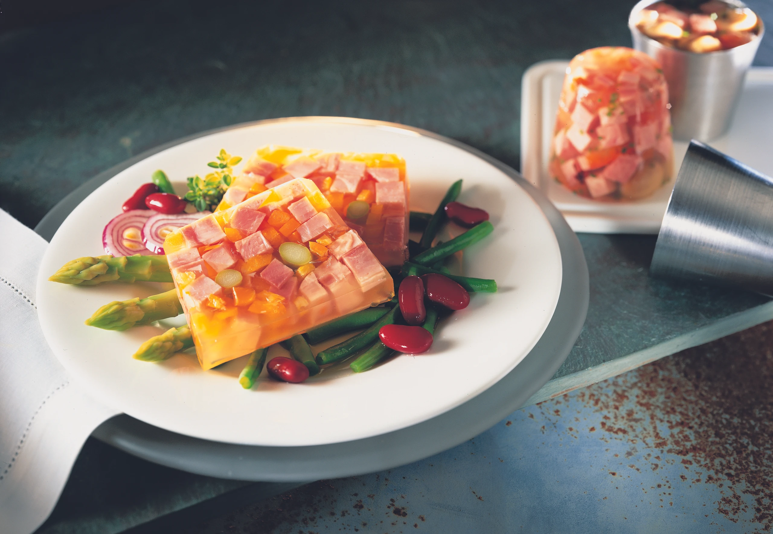 Terrine stürzen, Folie entfernen. Mariniertes Gemüse und Spargel auf Teller legen; restliche Marinade über den Spargel träufeln. Sulz in Scheiben schneiden, auf dem Gemüse anrichten.