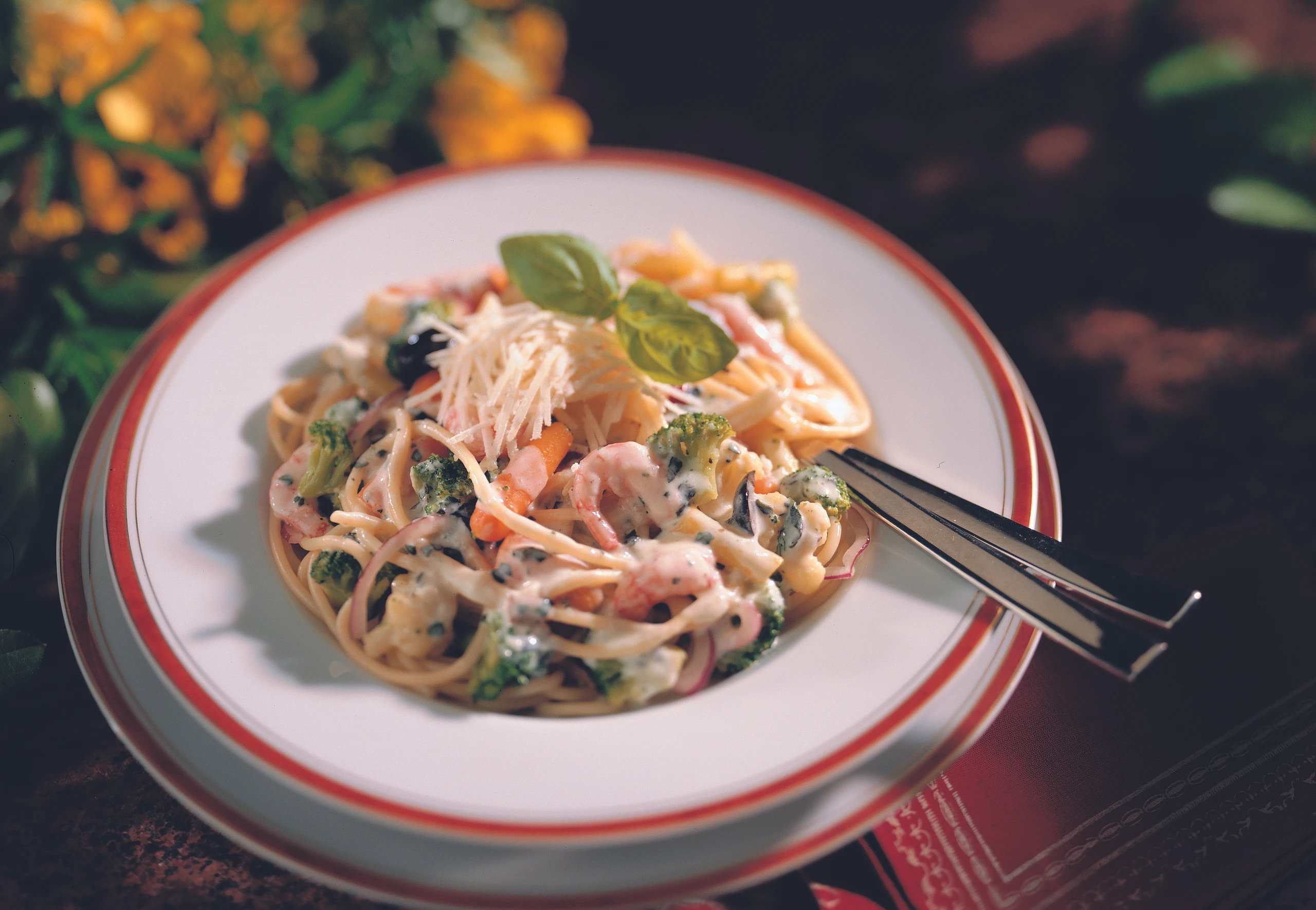 Gemüse-Spaghetti mit Oliven und Shrimps