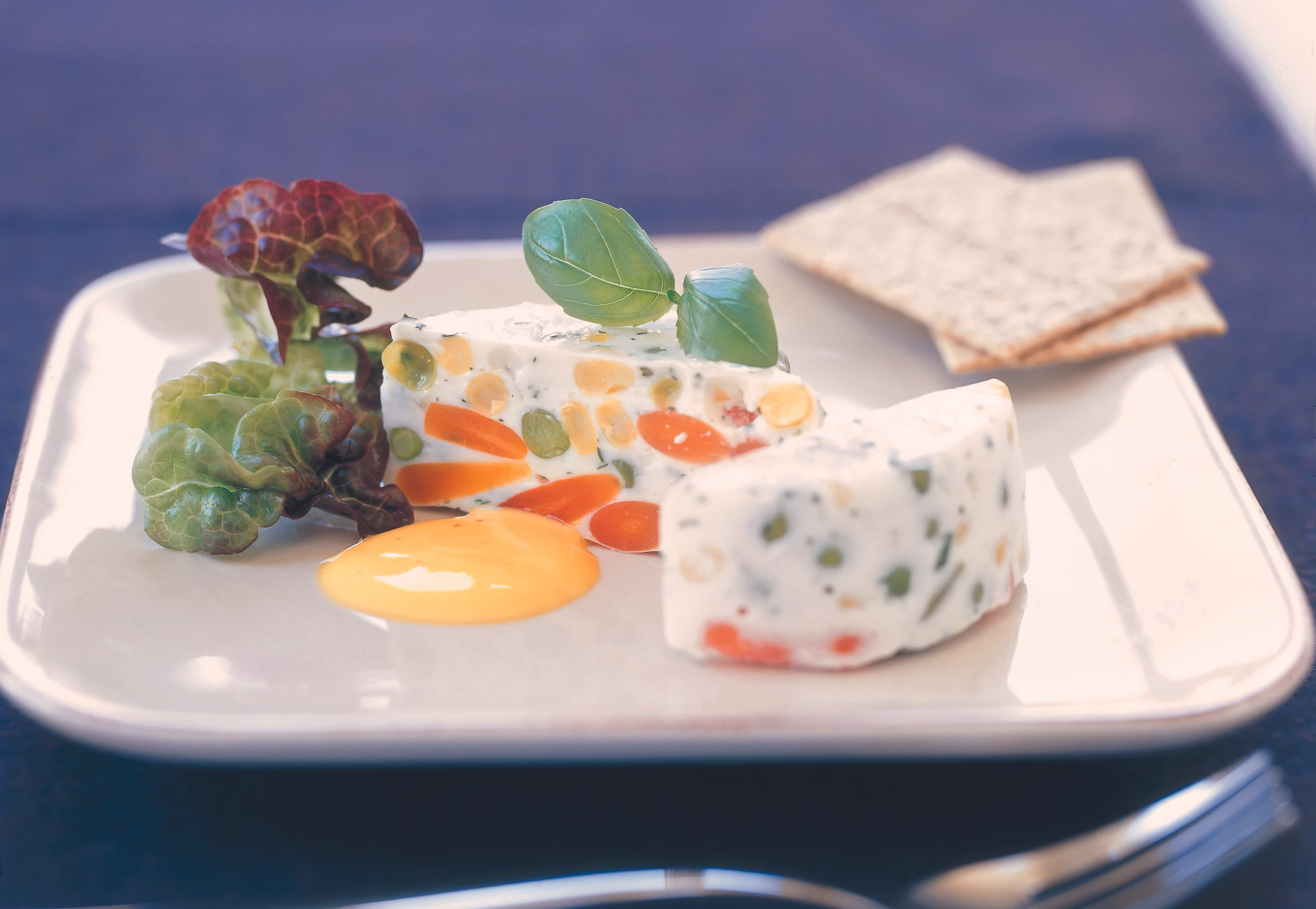 Joghurt salzen, pfeffern, Kräuter einrühren. Ca. 3 EL der Masse über Wasserdampf erwärmen. Gelatine gut ausdrücken, darin auflösen, zügig mit der übrigen Masse verrühren. Gemüse untermischen. Masse in die Förmchen füllen, glatt streichen und mit Frischhaltefolie zugedeckt ca. 4 Stunden kühlen.
