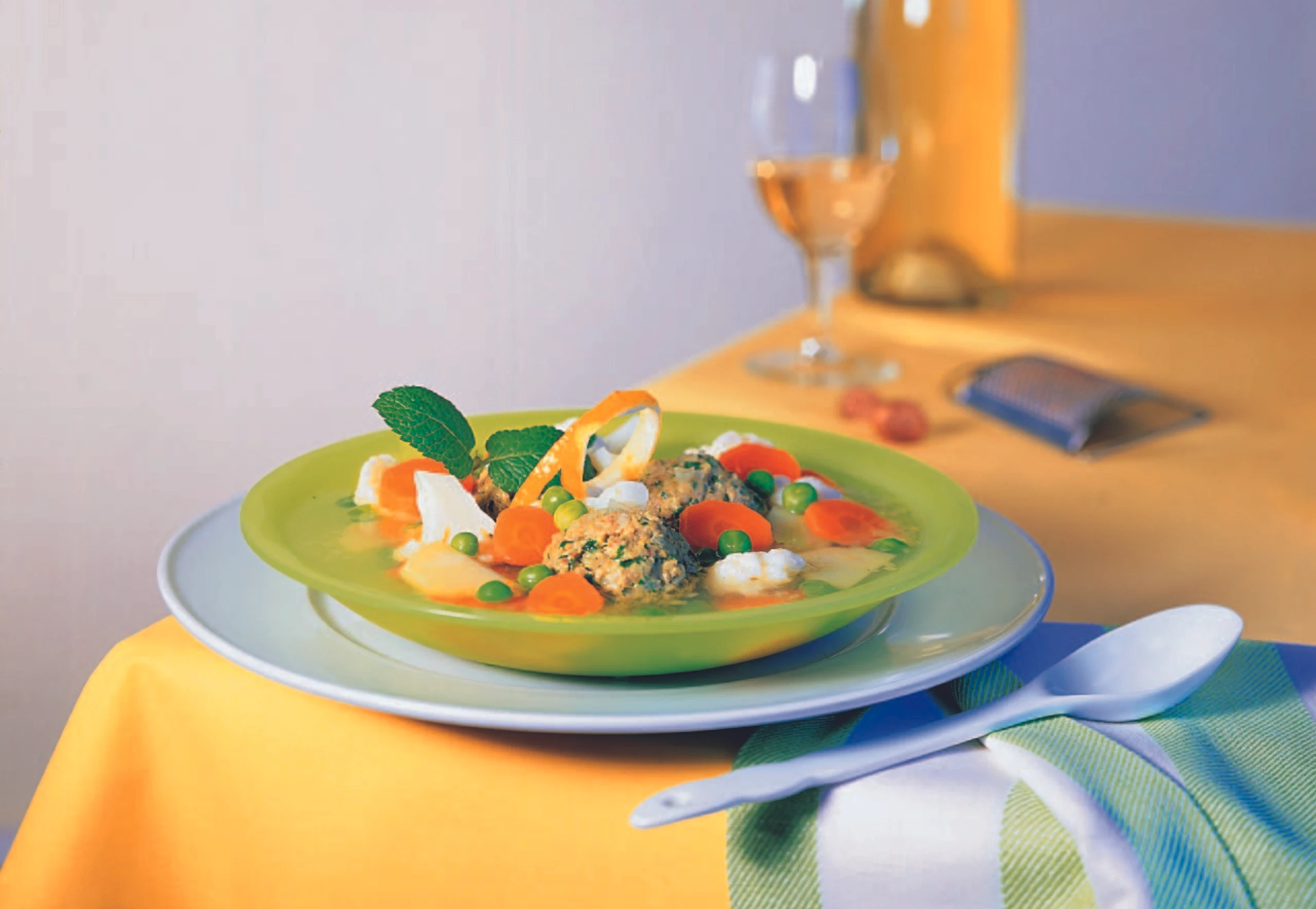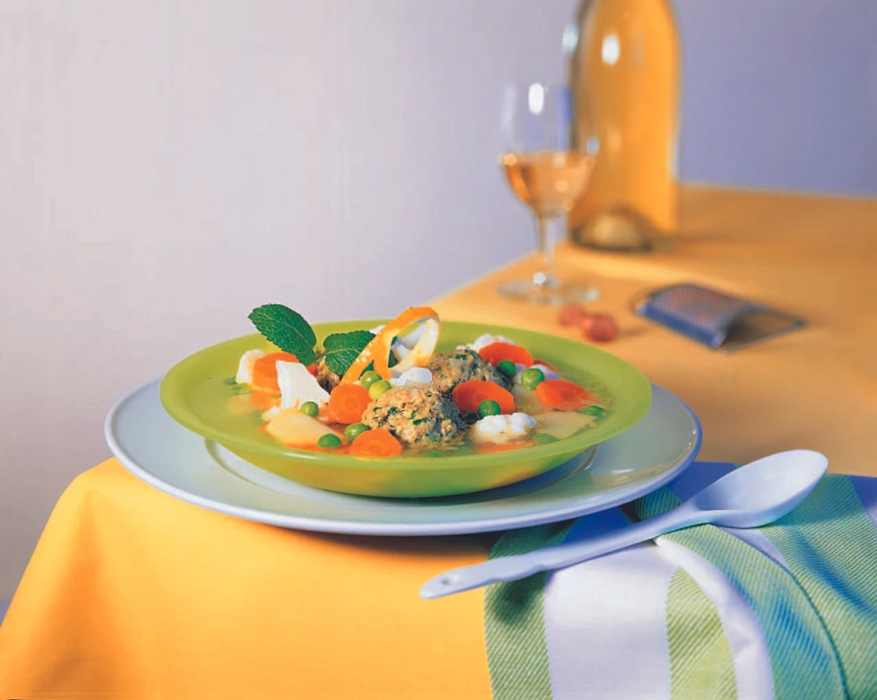 Suppe aufkochen, Erdapfel, Karotten, Karfiol und die Fleischbällchen zugeben. Eintopf zudecken und bei schwacher Hitze ca. 10 Minuten köcheln. Erbsen zugeben und 2 Minuten mitkochen. Eintopf mit Salz und Pfeffer würzen, in vorgewärmte Teller schöpfen, mit Minzeblättern und Zitronenschale garniert servieren.