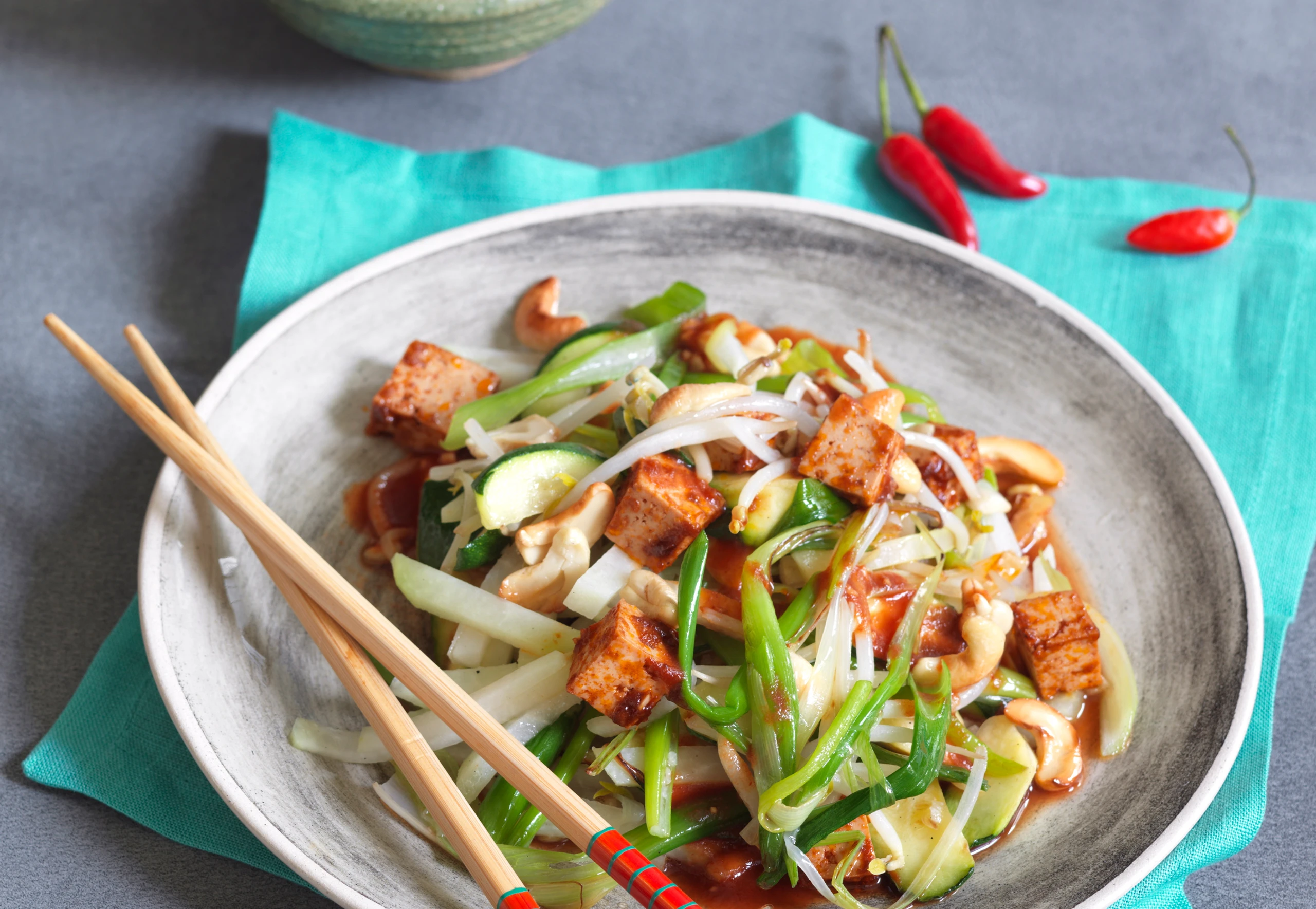 Sauce zum Gemüse gießen und unter Rühren erhitzen, bis die Sauce bindet. Gemüse mit gebratenem Tofu anrichten. Dazu passt Reis.