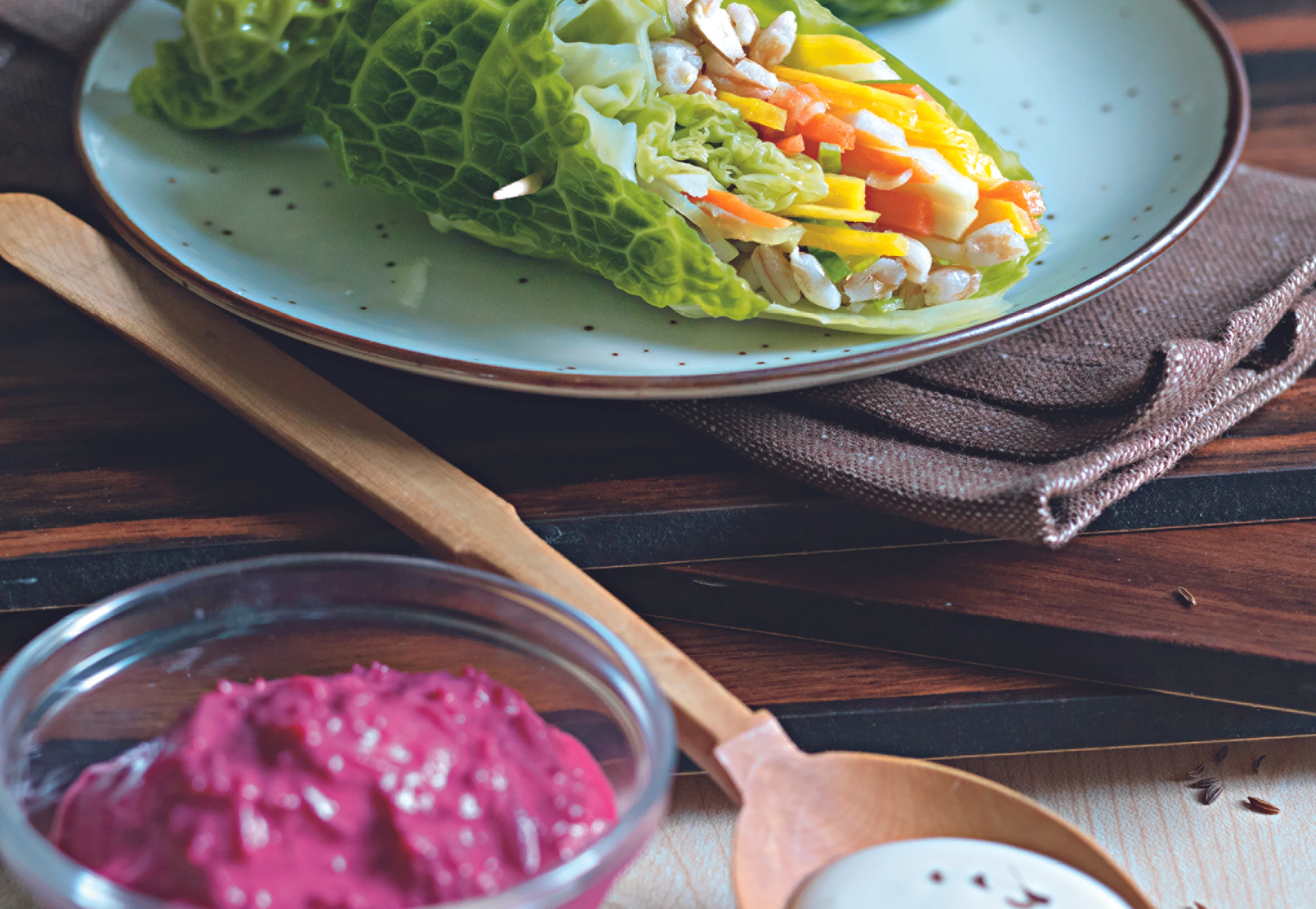 Fülle auf die Kohlblätter setzen, Blätter seitlich einschlagen. Wraps aufrollen, mit Zahnstochern fixieren. Wraps halbieren, mit Rote-Rüben-Dip servieren.