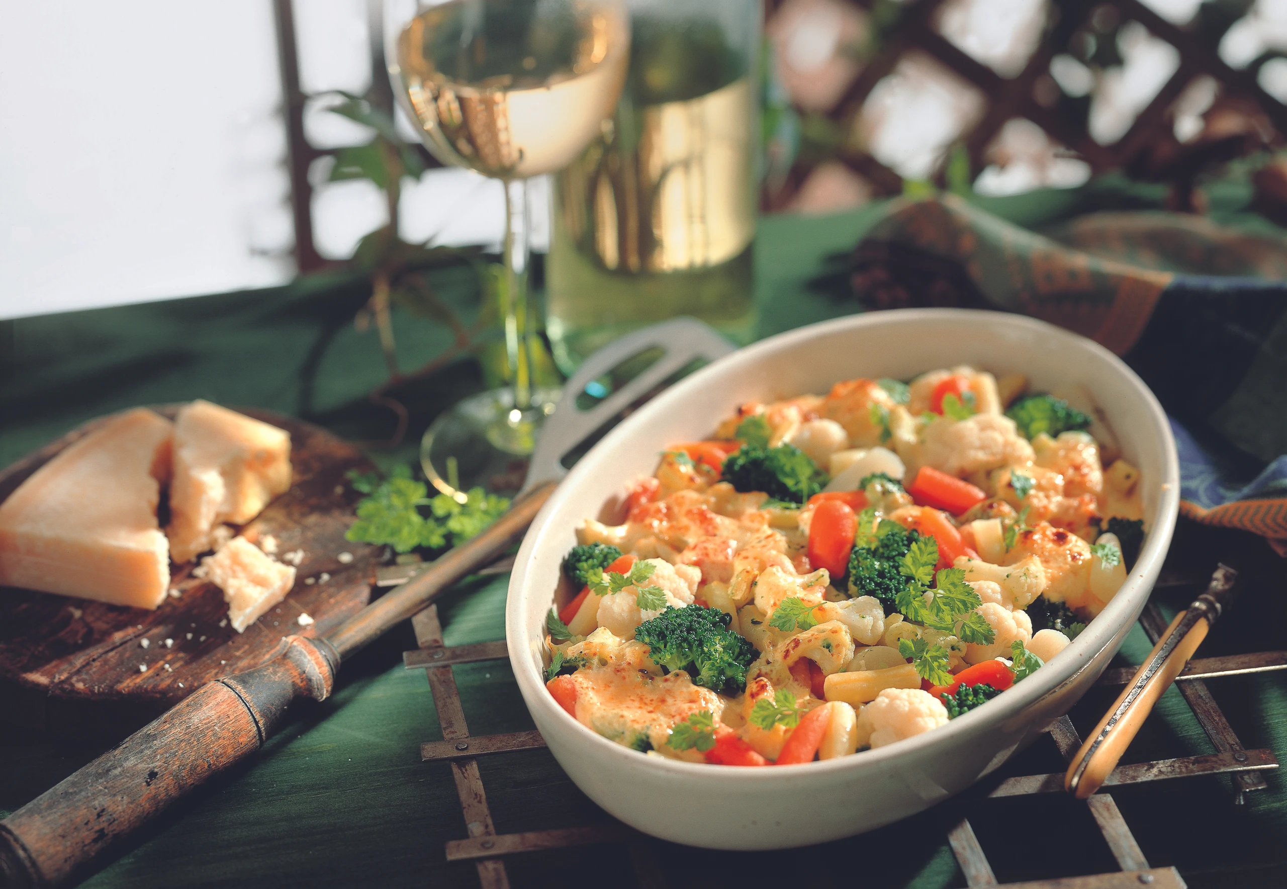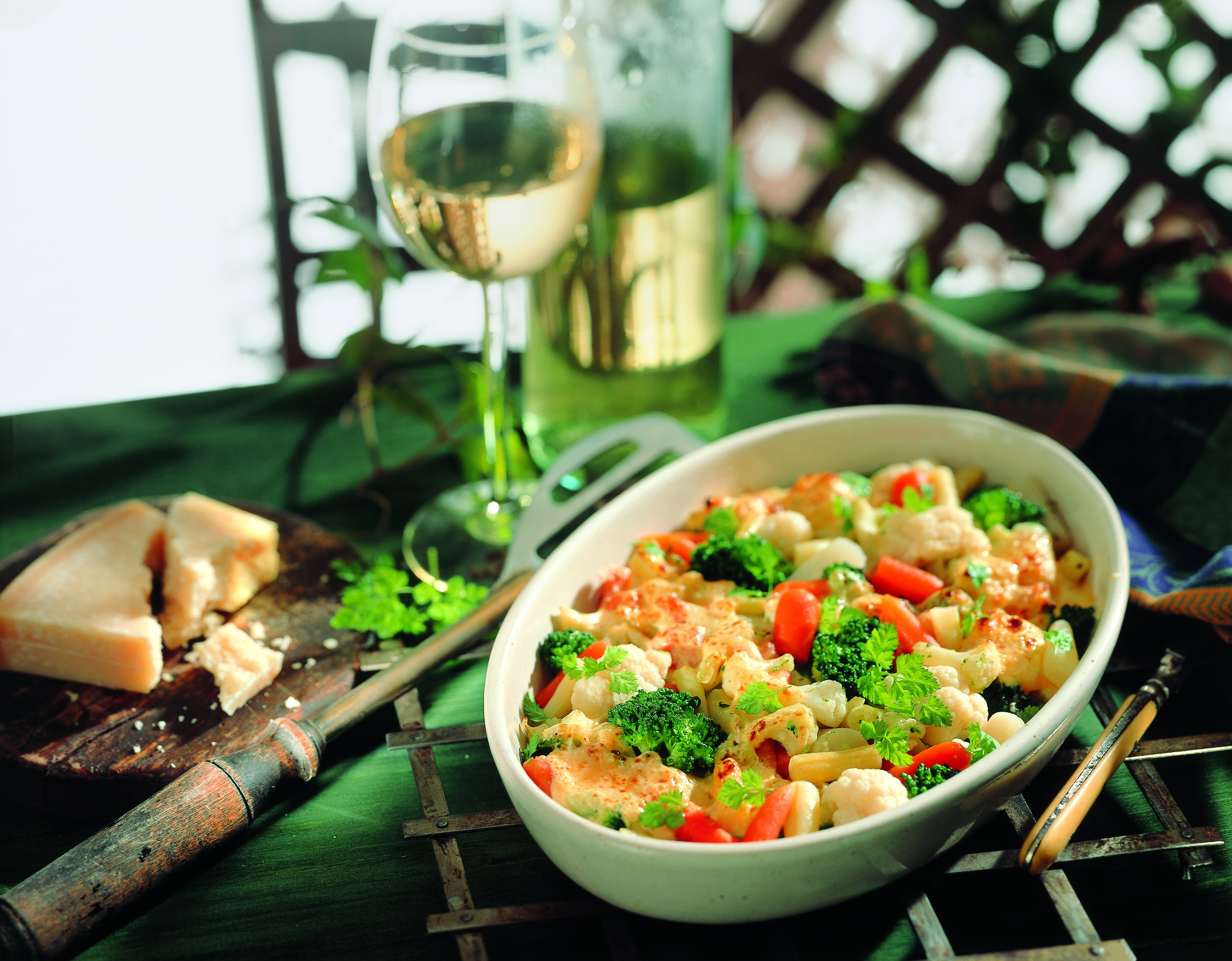- Gemüsemasse in die Auflaufform füllen, gleichmäßig verstreichen und mit dem Käse bestreuen. Auflauf im vorgeheizten Rohr (mittlere Schiene / Gitterrost) goldgelb überbacken (dauert ca. 5 Minuten). Auflauf am besten mit Petersilerdäpfeln oder mit gemischten Blattsalaten servieren.