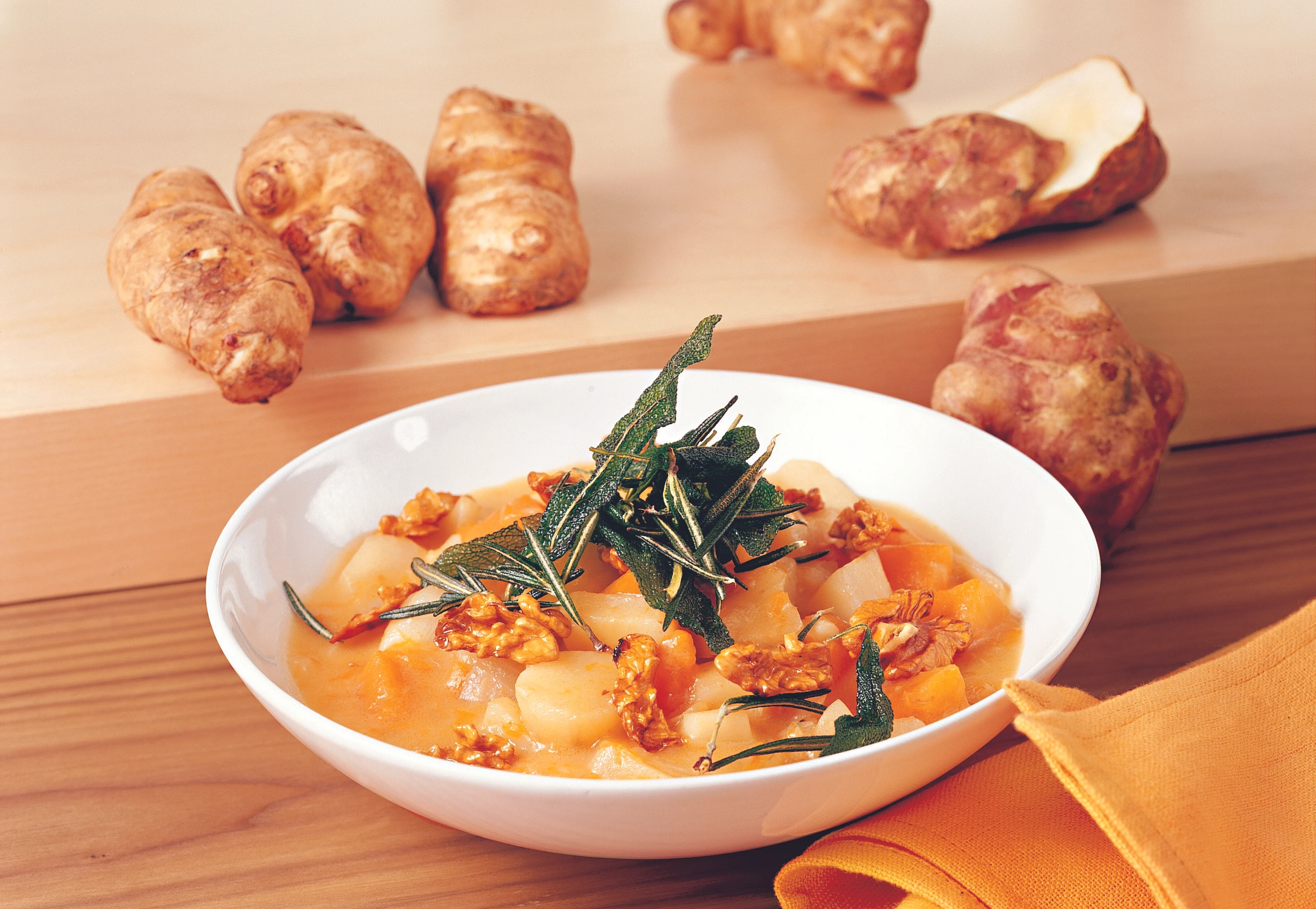 Topinambur, Kürbis und Zwiebeln schälen und in ca. 3 cm große Stücke schneiden. Gemüse in einen flachen Topf geben, mit dem Öl beträufeln und bei mittlerer Hitze leicht bräunen, dabei ständig rühren. Mit Mehl stauben, Wasser zugießen. Gemüse zudecken und bei mittlerer Hitze bissfest garen (ca. 10 Minuten). Mit Salz abschmecken.
