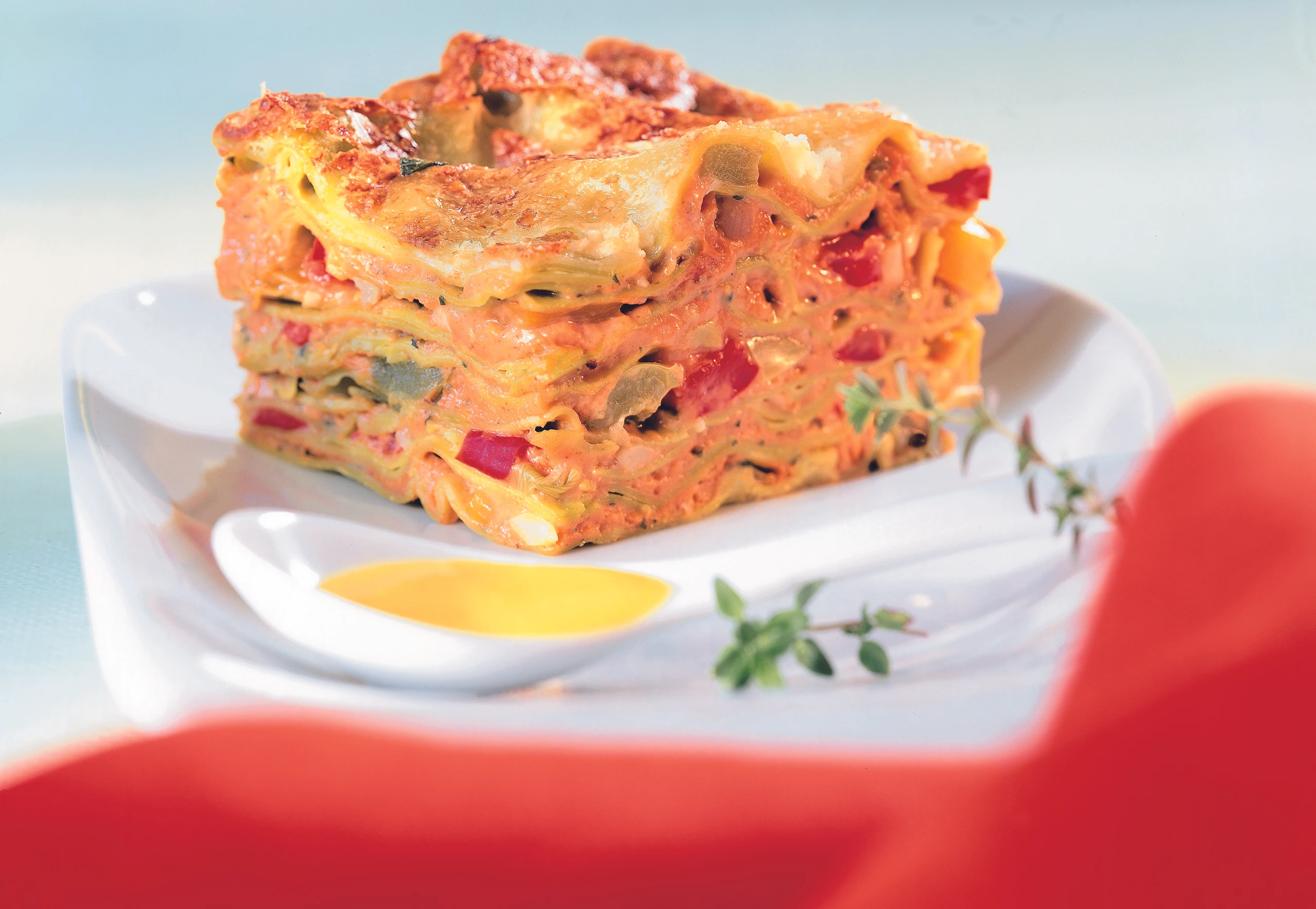 Auflaufform mit 3 Lasagneblättern auslegen, darauf ein Viertel der Fülle verteilen, mit 3 weiteren Lasagneblättern belegen. Diesen Vorgang mit übriger Fülle und restlichen Lasagneblättern wiederholen. Mit Fülle abschließen. Lasagne mit Mozzarella bestreuen, salzen, pfeffern und im Rohr (untere Schiene / Gitterrost) ca. 45 Minuten backen. Lasagne mit Paprikasauce anrichten.