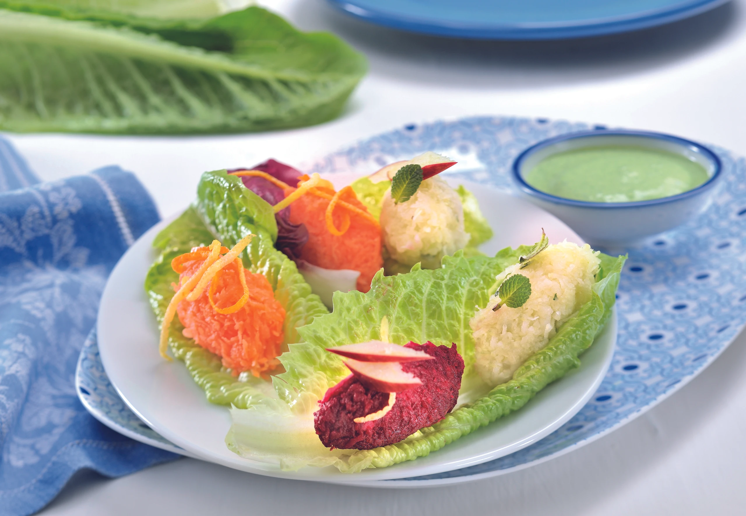 Aus dem Gemüse mit einem Löffel Nockerl formen und auf den Salatblättern anrichten. Mit restlicher Zitronenschale bestreuen, Kräuterdressing dazu reichen.