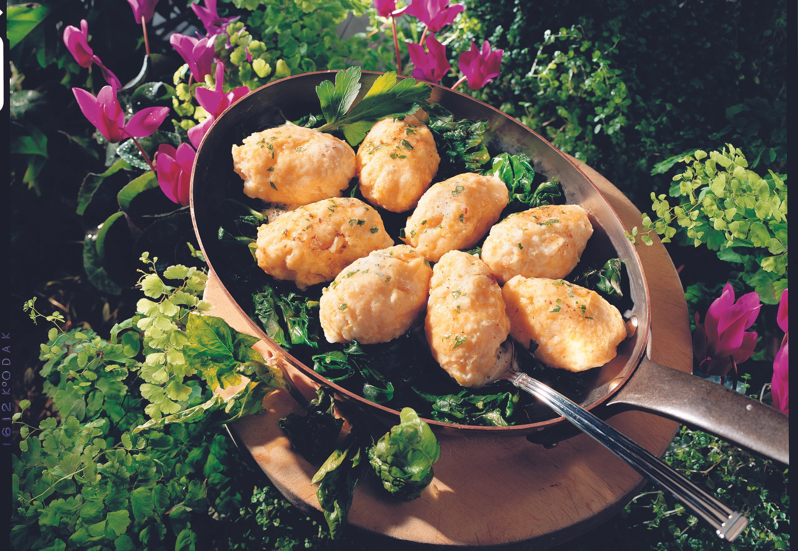 Salzwasser zum Kochen bringen. Aus der Masse 12 gleichgroße Nocken ausstechen, in das kochende Wasser legen und ca. 8 Minuten schwach wallend köcheln.
