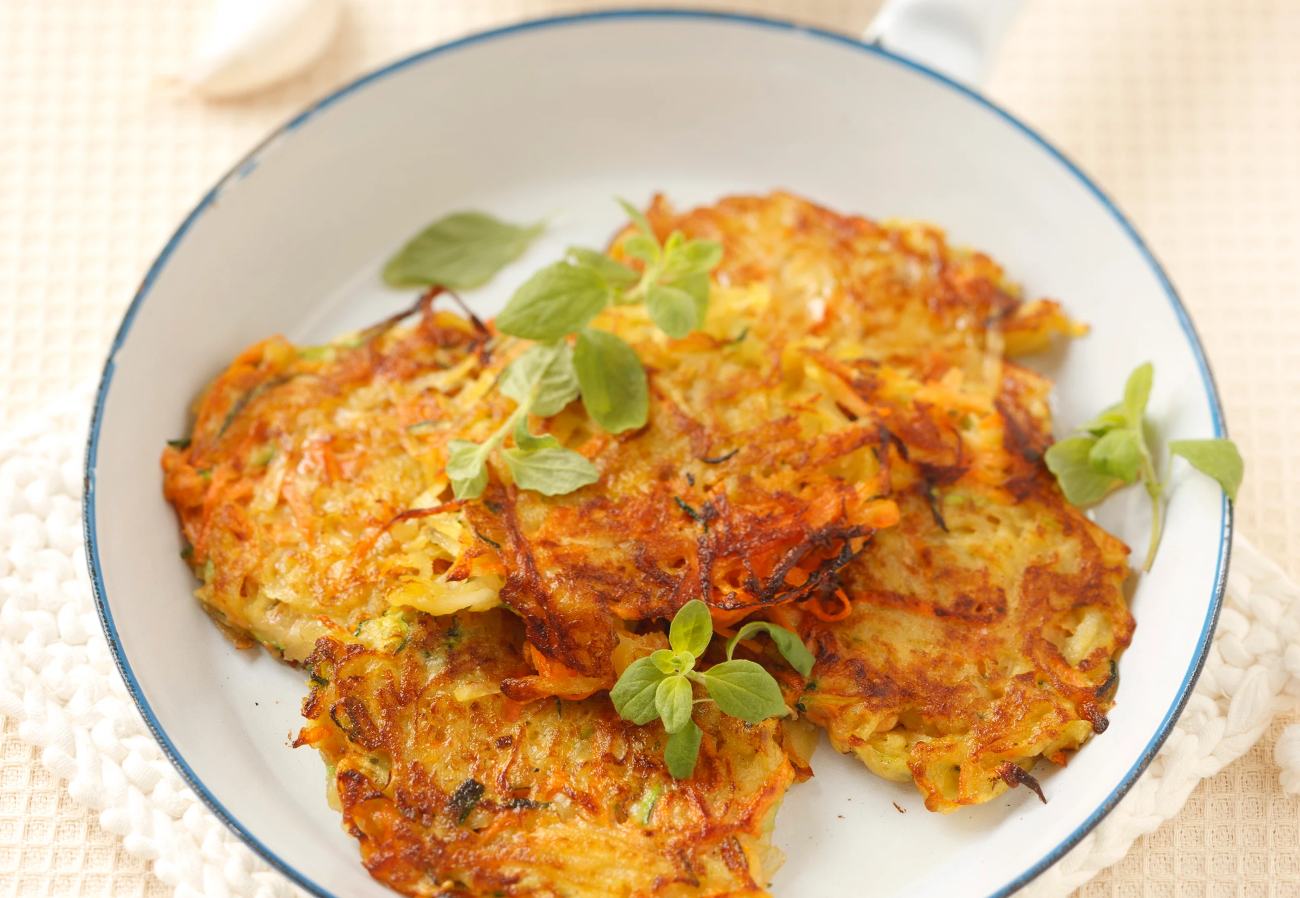 Für die Puffer Erdäpfel, Karotten und Zwiebel schälen. Erdäpfel, Karotten und Zucchini raspeln und gut ausdrücken. Zwiebel klein würfeln. Gemüse, Zwiebel und Eier verrühren,
