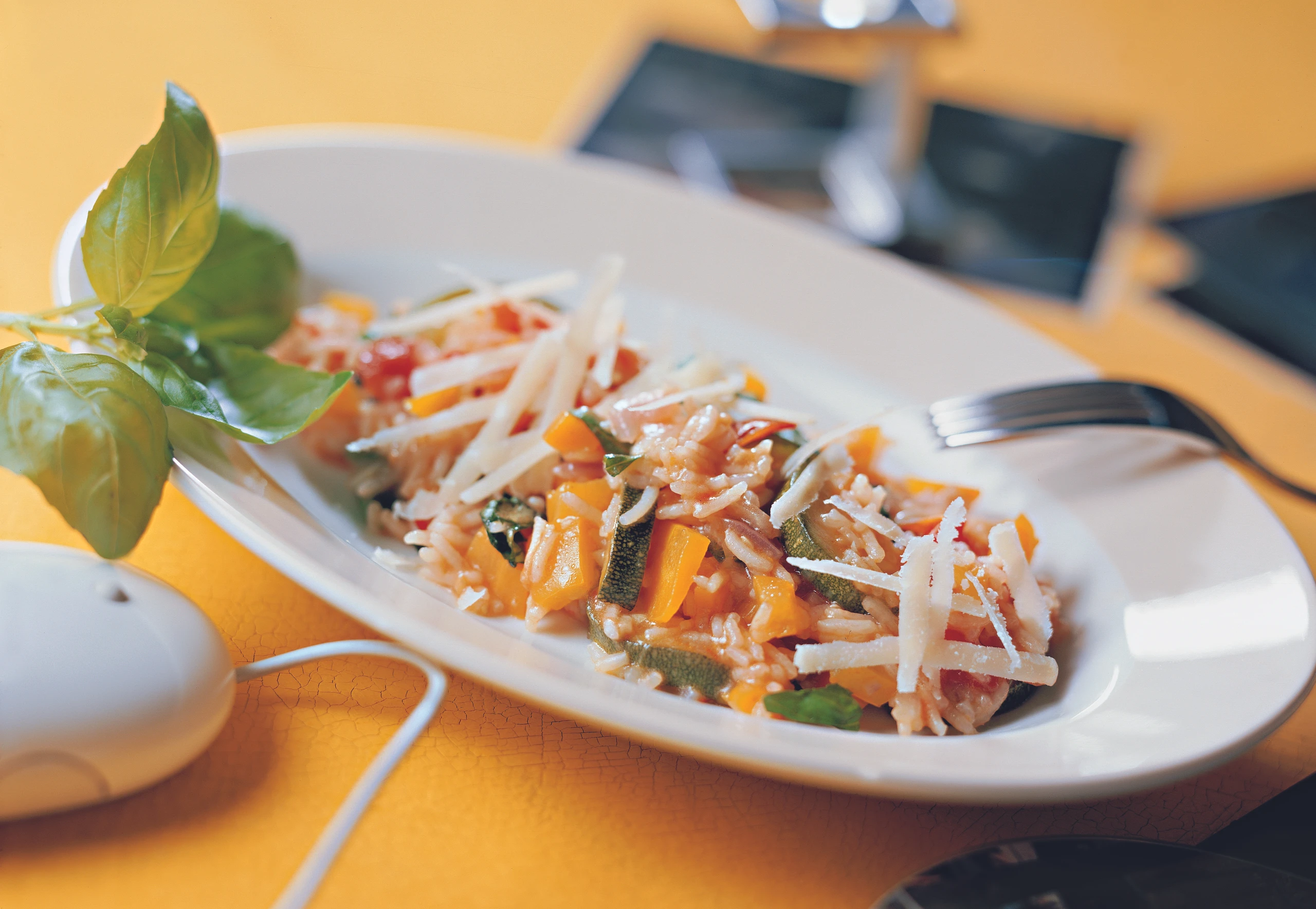 Zwiebeln, Knoblauch und Chili in Öl anschwitzen. Paprika, Karotten und Zucchini unterrühren. Reis einrühren und kurz mitrösten. Paradeiser zugeben. Mit Wasser oder Suppe aufgießen. Reis aufkochen, salzen, pfeffern und bei schwacher Hitze zugedeckt ca. 20 Minuten dünsten. Dabei öfter umrühren. Reis mit Basilikum und Parmesan bestreuen.