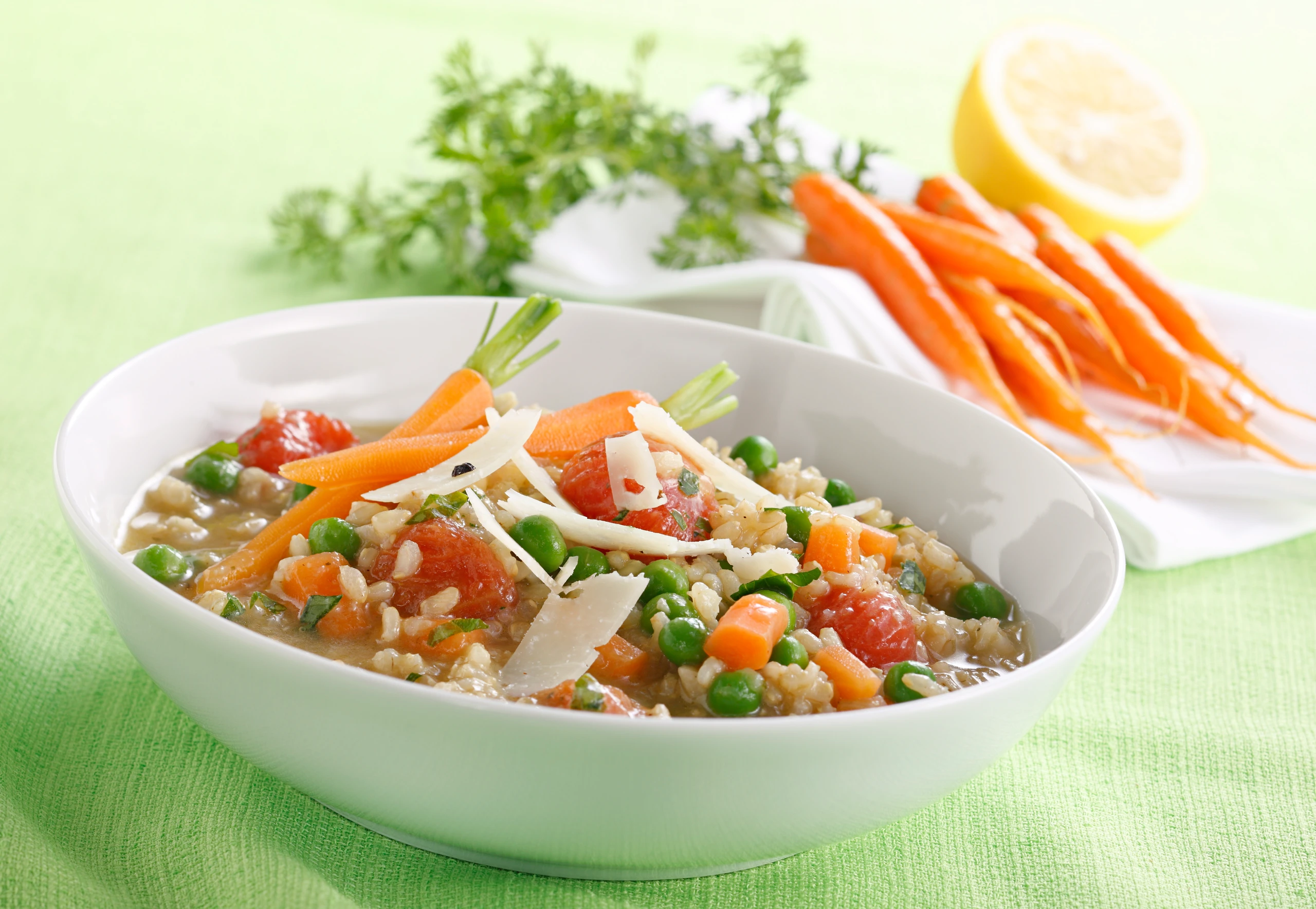 Karotten untermischen, Reis weitere 10 Minuten köcheln. Erbsen, Paradeiser und Weißwein zugeben, Reis köcheln, bis er körnig weich und cremig ist (5–10 Minuten).