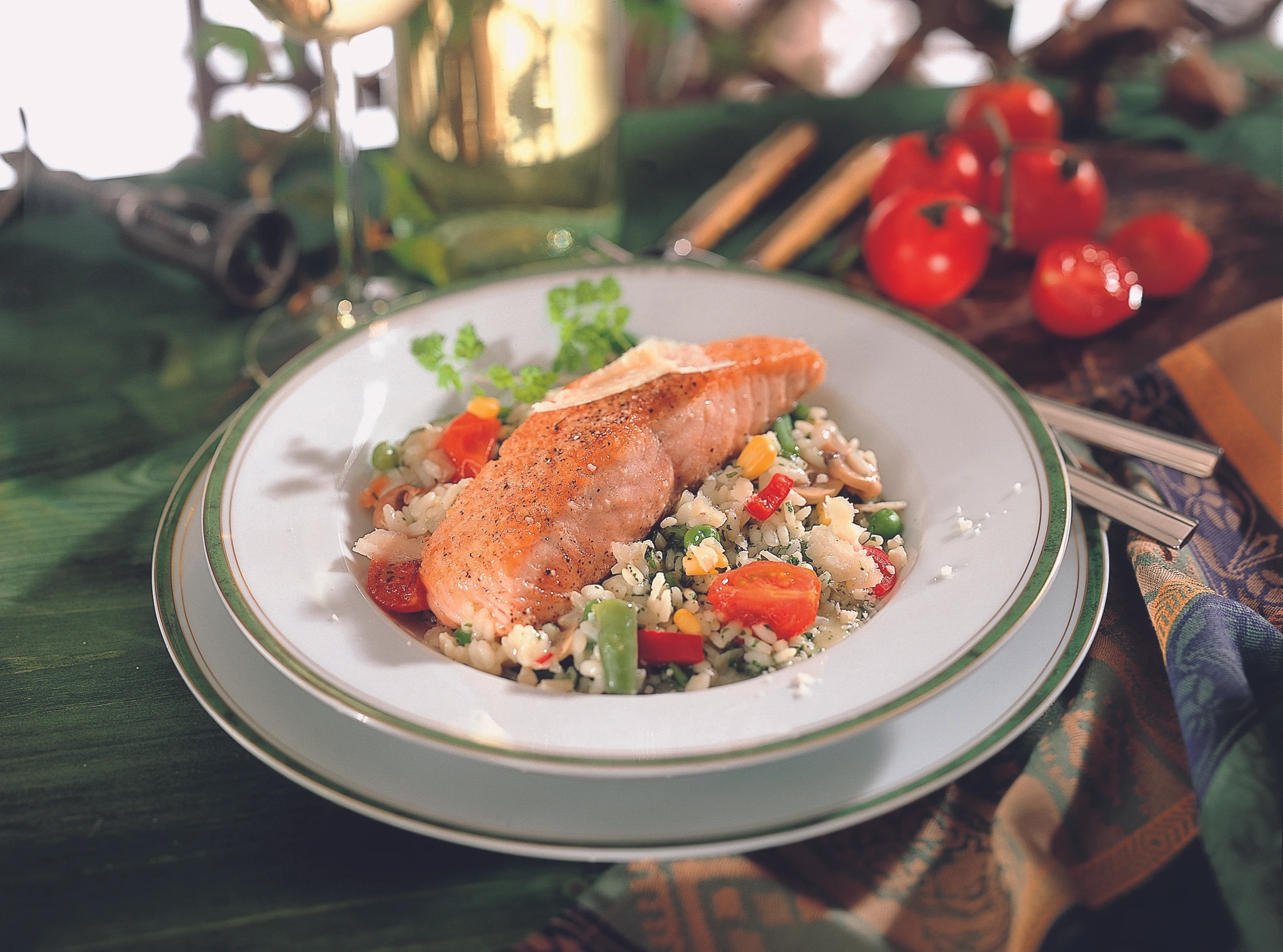 - Risotto salzen und pfeffern, mit dem Gemüse, den übrigen Butterstücken, Parmesan und Kräutern vermischen. Sollte das Risotto zu dick sein, verdünnt man es mit etwas heißer Gemüsesuppe. Risotto sofort mit den Lachsfilets und den Kirschparadeisern anrichten. Das Gemüserisotto am besten zusätzlich mit grob gehobeltem Parmesan bestreuen.