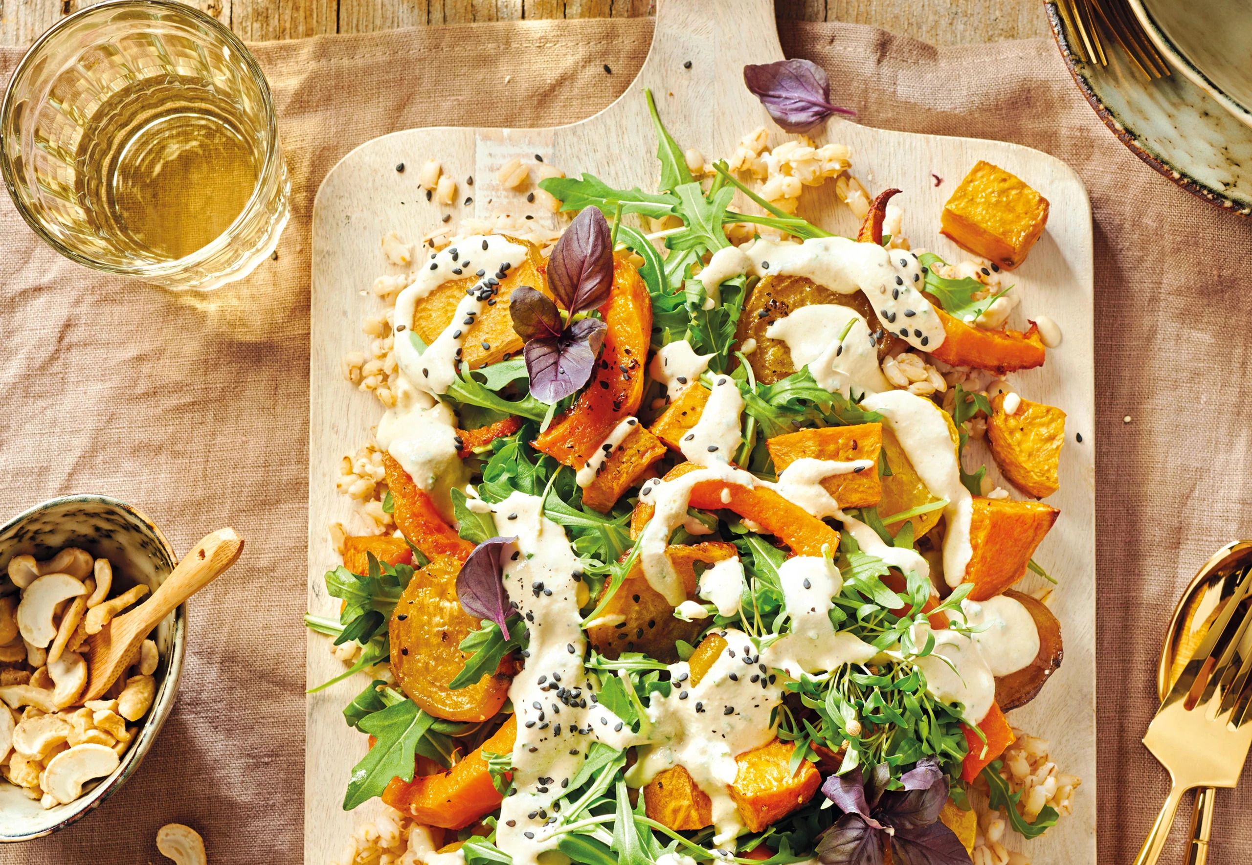 Gerste, Ofengemüse, Rucola, Kresse und Basilikum auf einer Platte anrichten, mit Dressing beträufeln und mit Sesam bestreuen.
