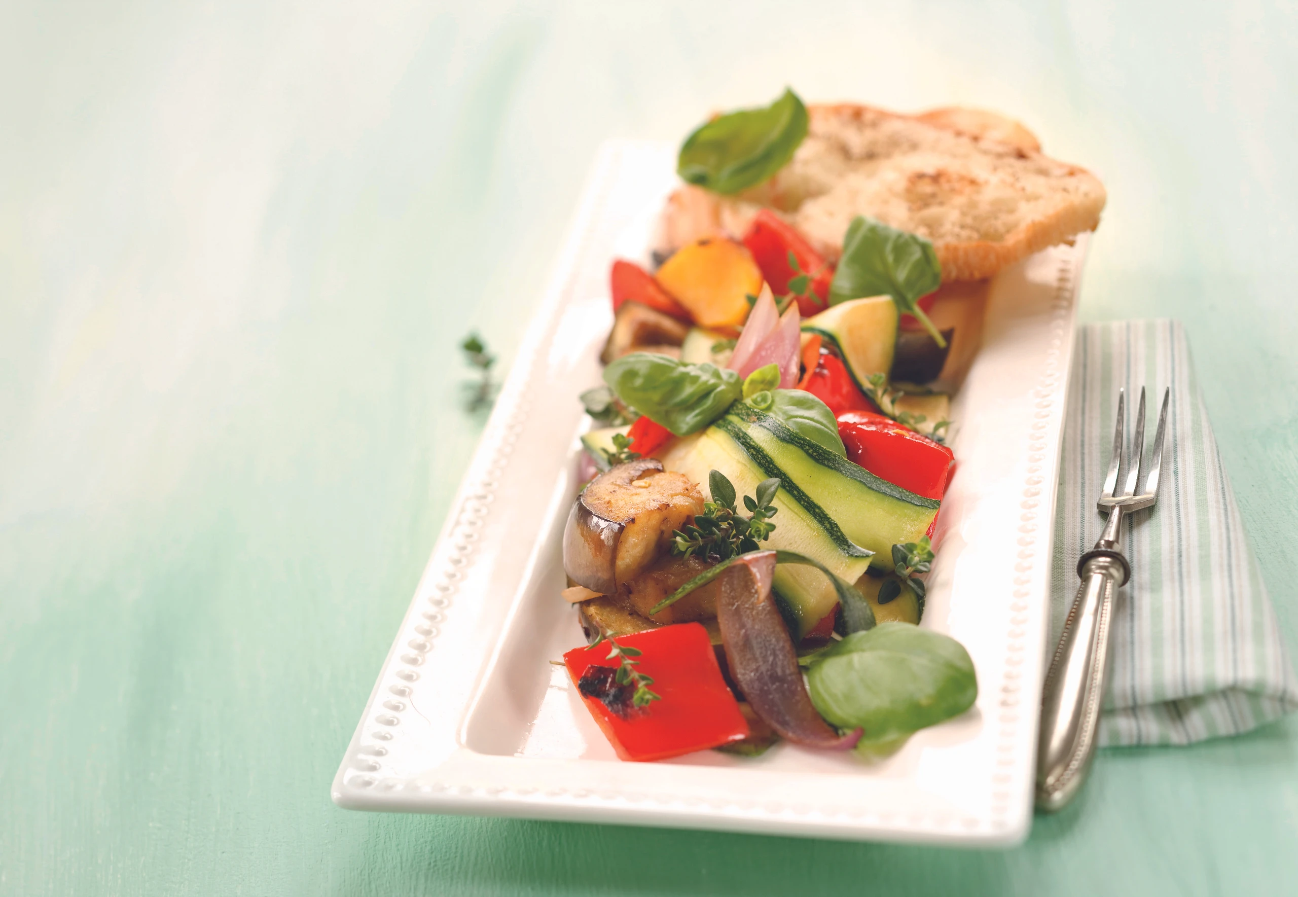 Paprika in Öl scharf anbraten. Melanzani, Zwiebeln und Zucchini untermischen und mitbraten. Gemüse mit Balsamico ablöschen und mit 125 ml Gemüsesuppe aufgießen. Gemüse mit Thymian und Basilikum verfeinern, vom Herd nehmen und ziehen lassen.