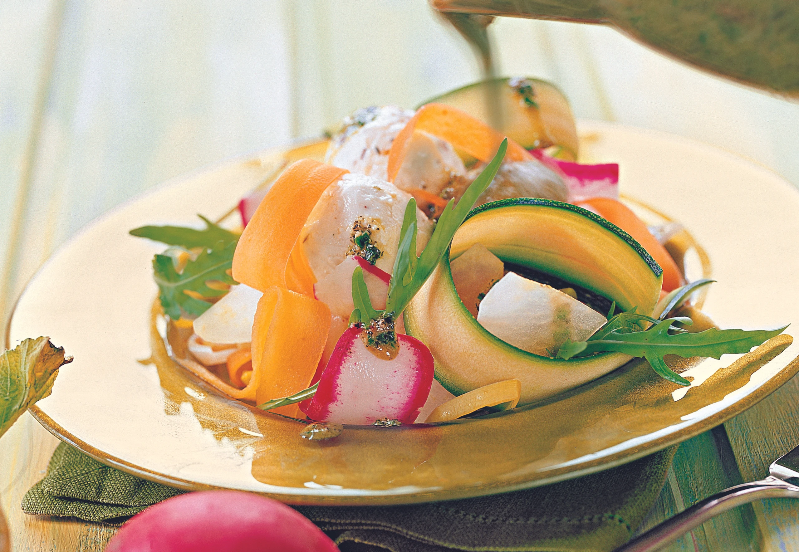 Karotten und Gelbe Rüben schälen. Radieschen, Zucchini und Rucola putzen. Gemüse mit der Brotschneidemaschine oder dem Sparschäler in dünne Scheiben schneiden. Lauch halbieren, waschen und in lange Streifen schneiden. Karotten, Rüben und Lauch blanchieren (ca. 2 Minuten in Salzwasser kochen, in Eiswasser abschrecken) und abtropfen lassen. Mit den übrigen Salatzutaten und dem Dressing vermischen. Salat mit den Käsebällchen anrichten, salzen und pfeffern.