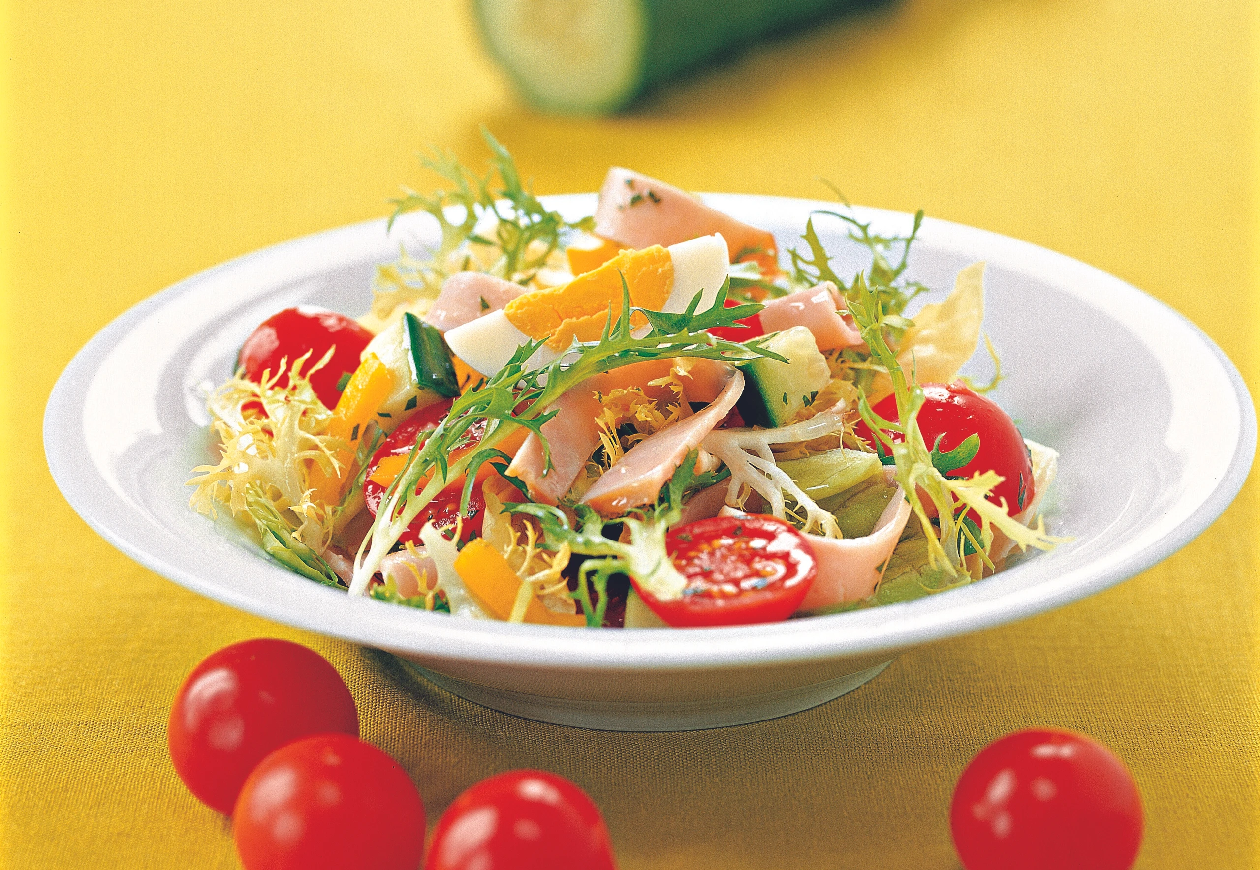 Salate, Paprika, Paradeiser, Gurke und Schinken mit der Marinade vermischen. Salat mit Eiern garniert servieren.