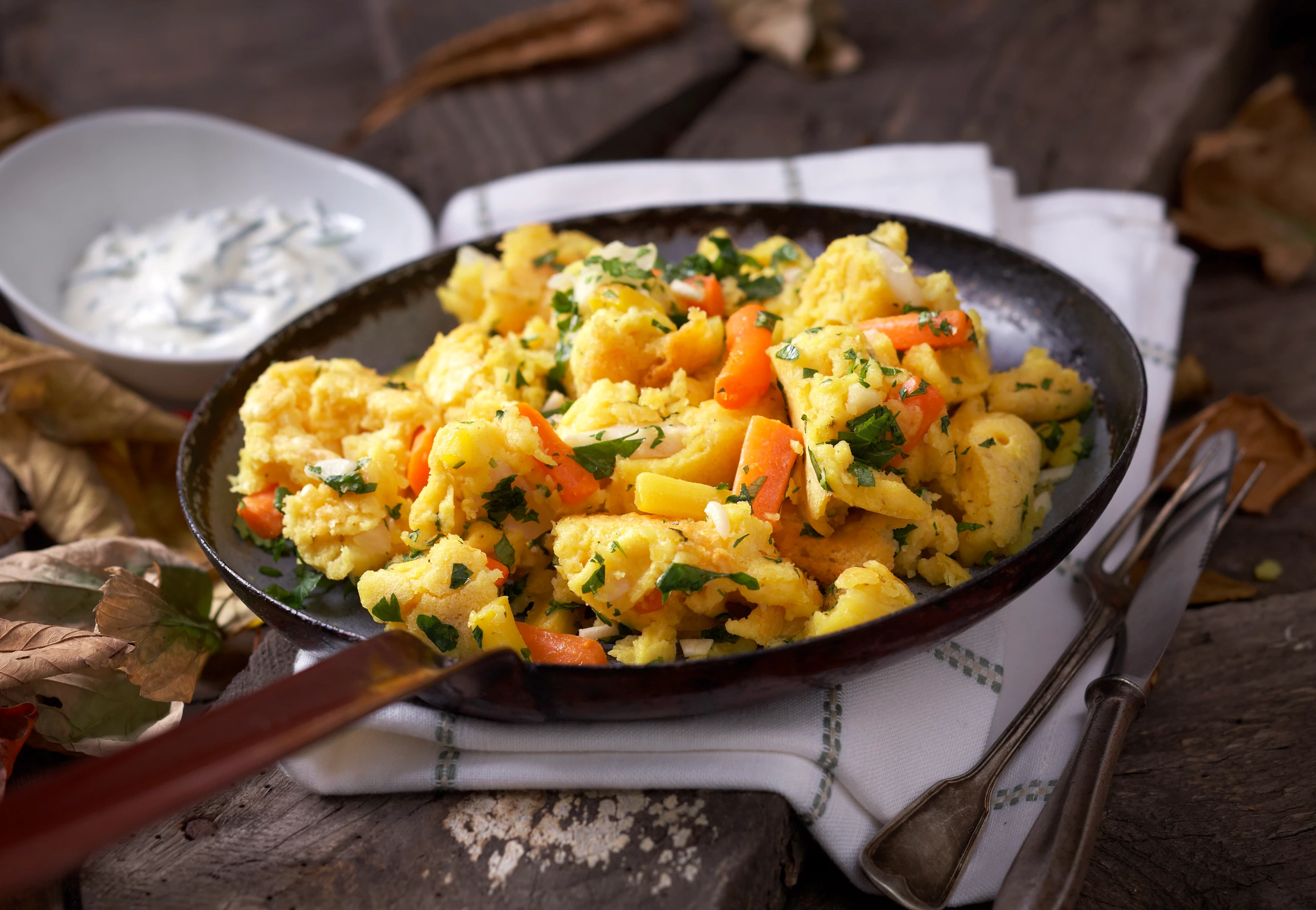 Schmarren zerpflücken und in der übrigen Butter schwenken. Schmarren mit Knoblauch und Petersilie vermischen und mit dem Schnittlauchrahm anrichten.