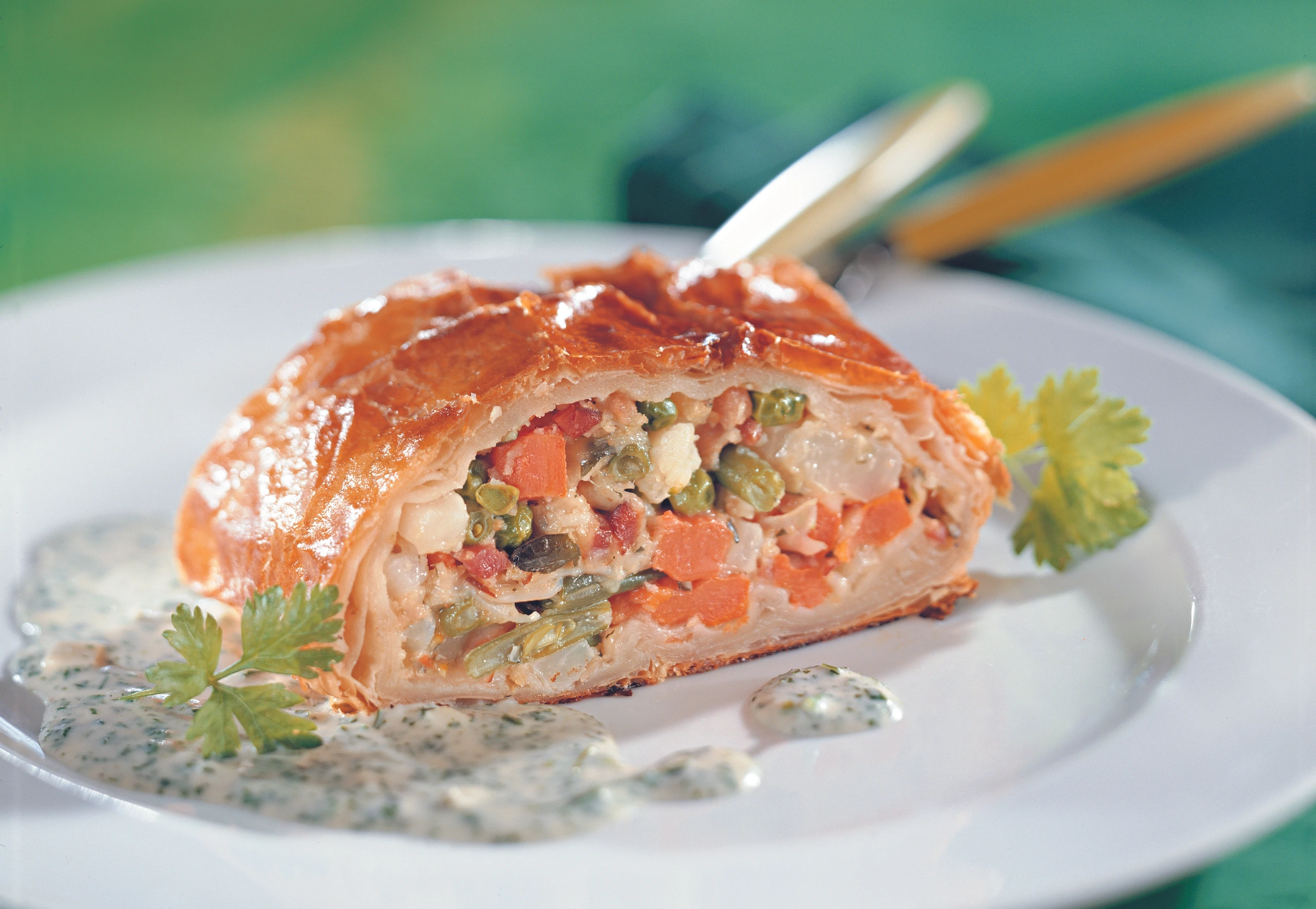 Strudel vor dem Servieren einige Minuten rasten lassen, in Stücke schneiden und mit der Kräutersauce anrichten.