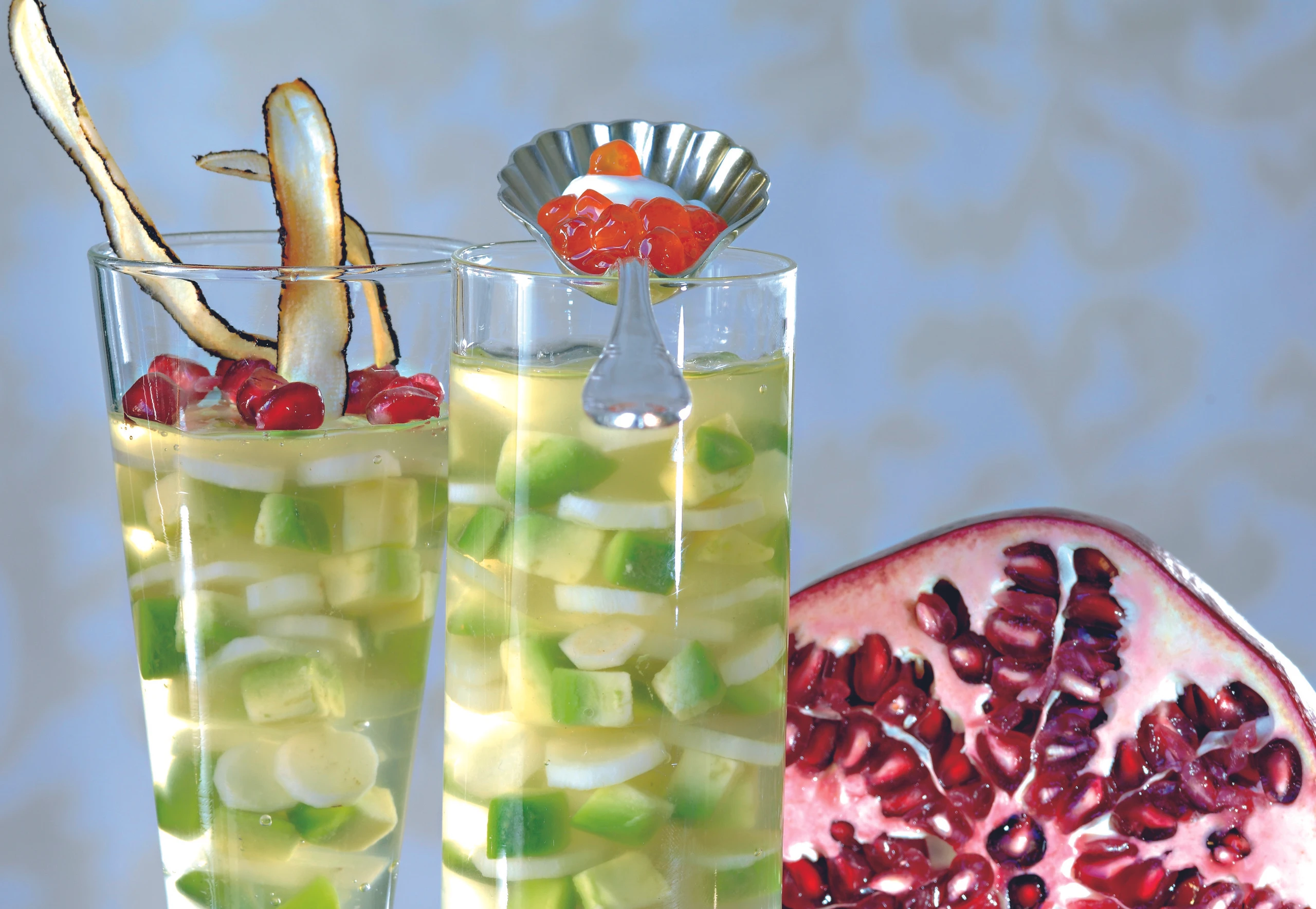 Sülzchen mit Granatapfelkernen, Kaviar, Rahm und Schwarzwurzelschalen garnieren.