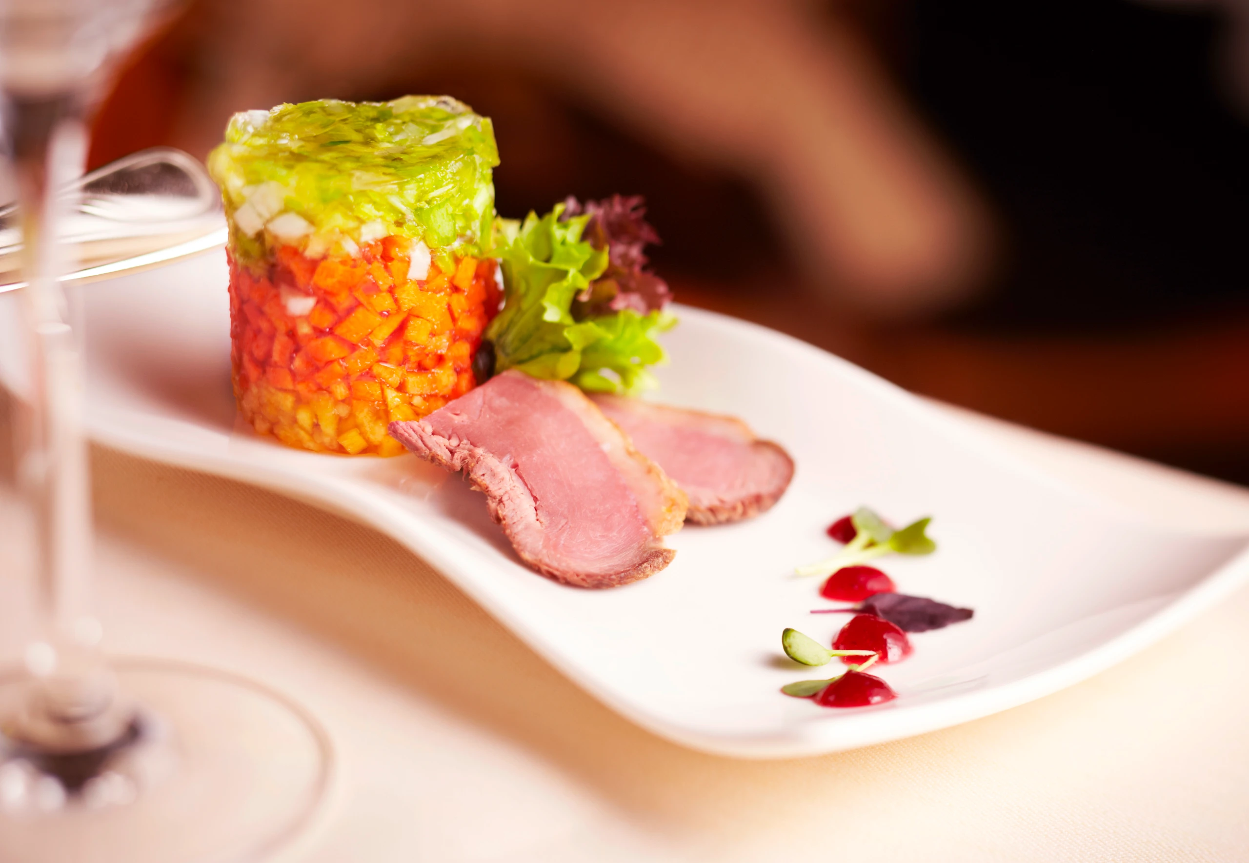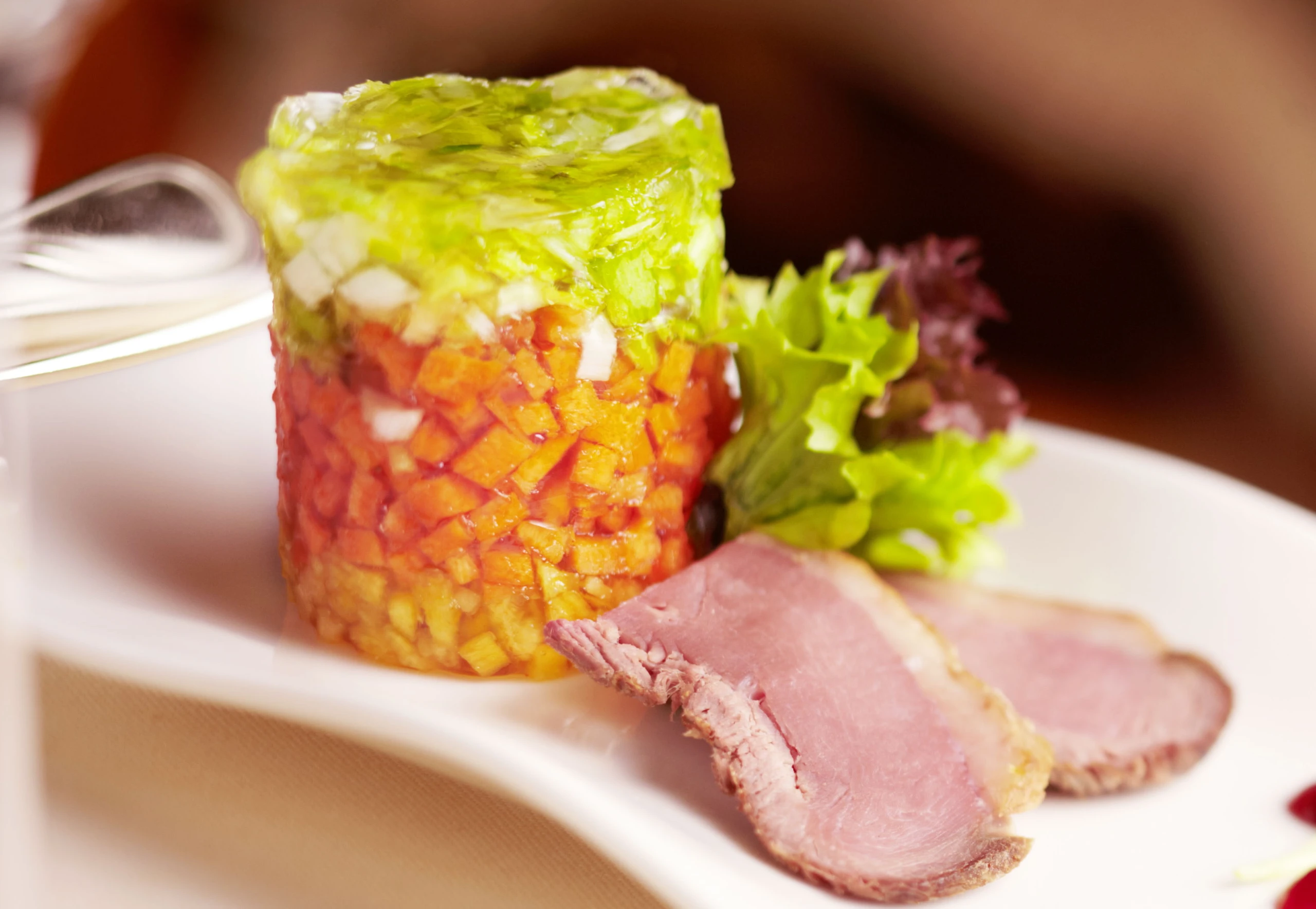 Entenbrust quer in ca. 0,5 cm dicke Scheiben schneiden. Förmchen kurz in heißes Wasser tauchen, Sülzchen auf Teller stürzen, mit Sauce und Entenbrust anrichten. Eventuell mit Salat und Kresse garnieren.
