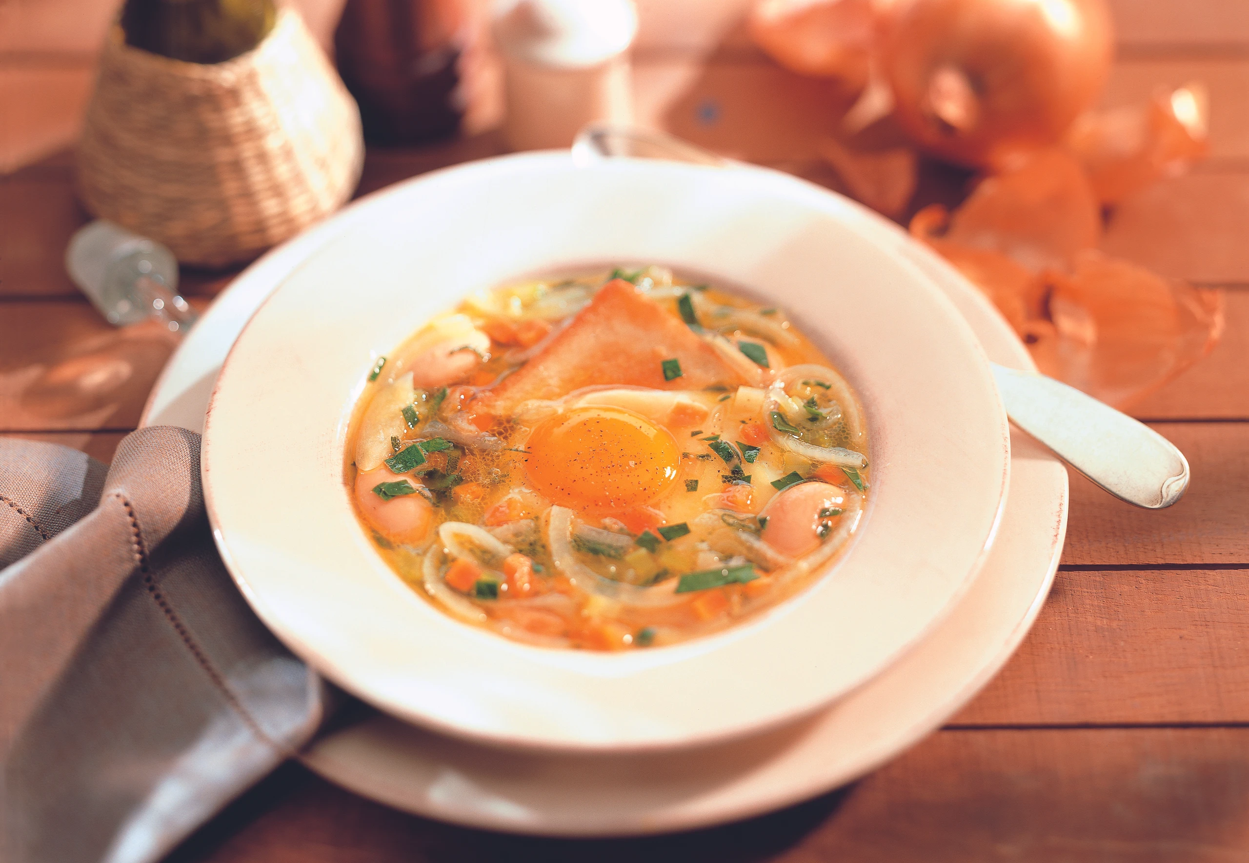 Während die Suppe kocht Backrohr auf Grillstellung vorheizen. Brotscheiben auf den Gitterrost legen und beidseitig toasten. Brotscheiben in vorgewärmte Teller legen, Eier aufschlagen und auf die Brotscheiben setzen. Heiße Suppe mit einem Schöpfer behutsam zugießen und sofort servieren.