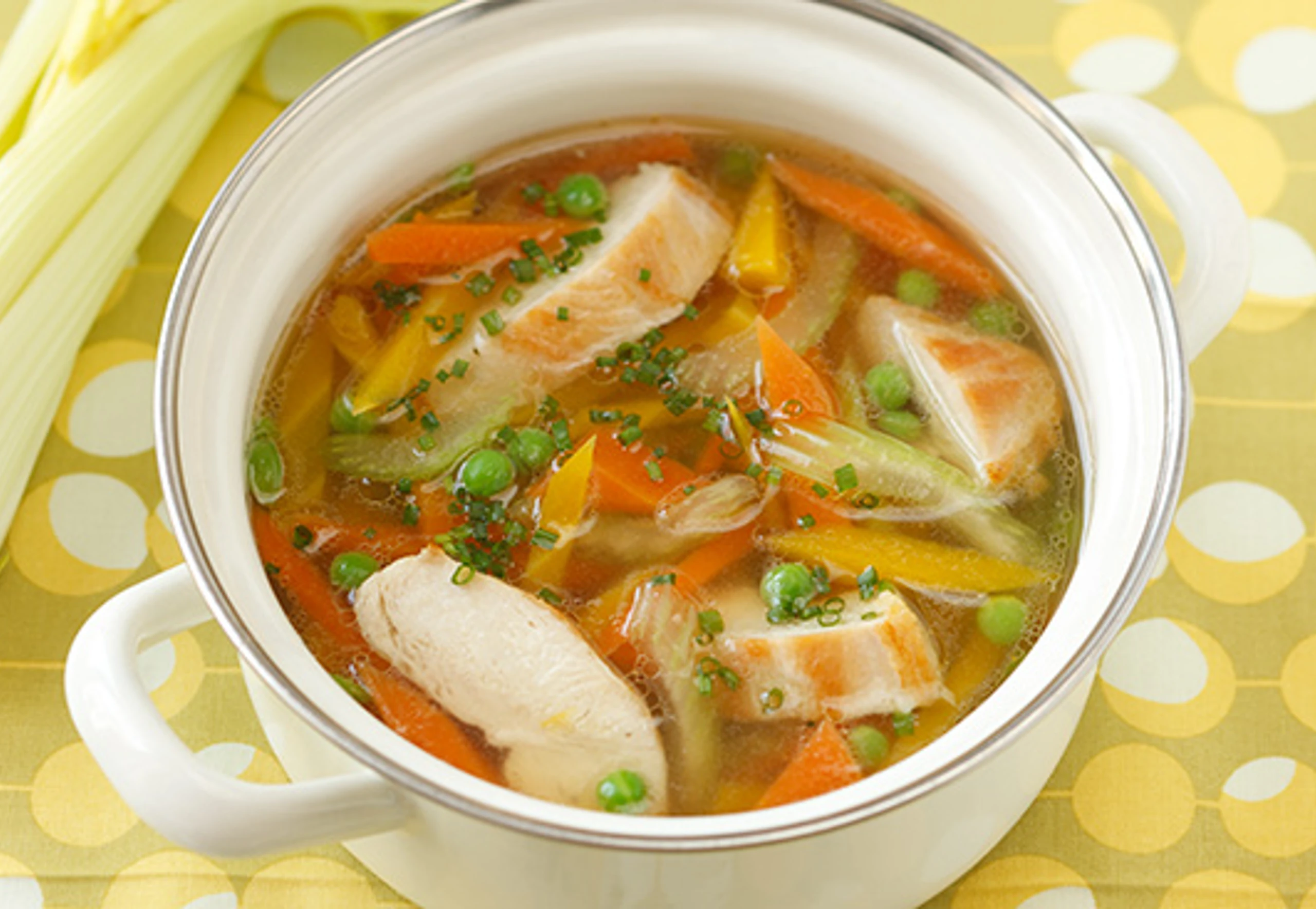 - Suppe aufkochen. Karotten und Rüben zugeben und ca. 8 Minuten köcheln. Nach halber Garzeit Sellerie und Erbsen zugeben.