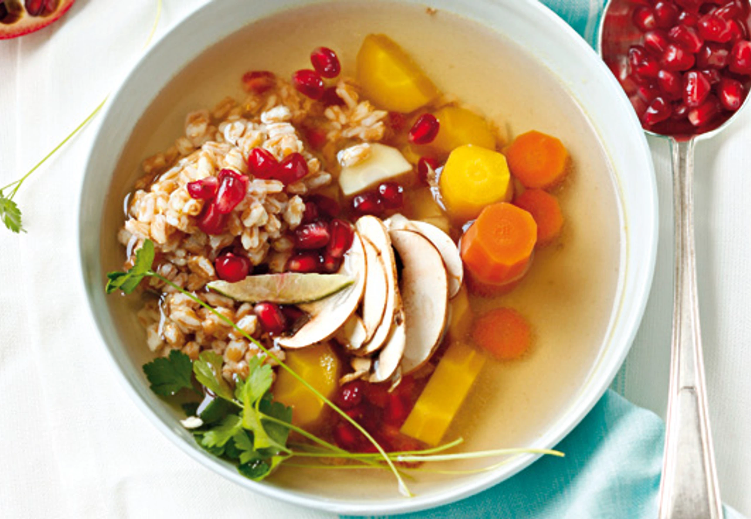 - Suppe abseihen und aufkochen. Wurzelgemüse zugeben und bissfest köcheln. Gegen Ende der Garzeit Ingwer und Champignons zugeben. Reis und Granatapfelkerne untermischen.