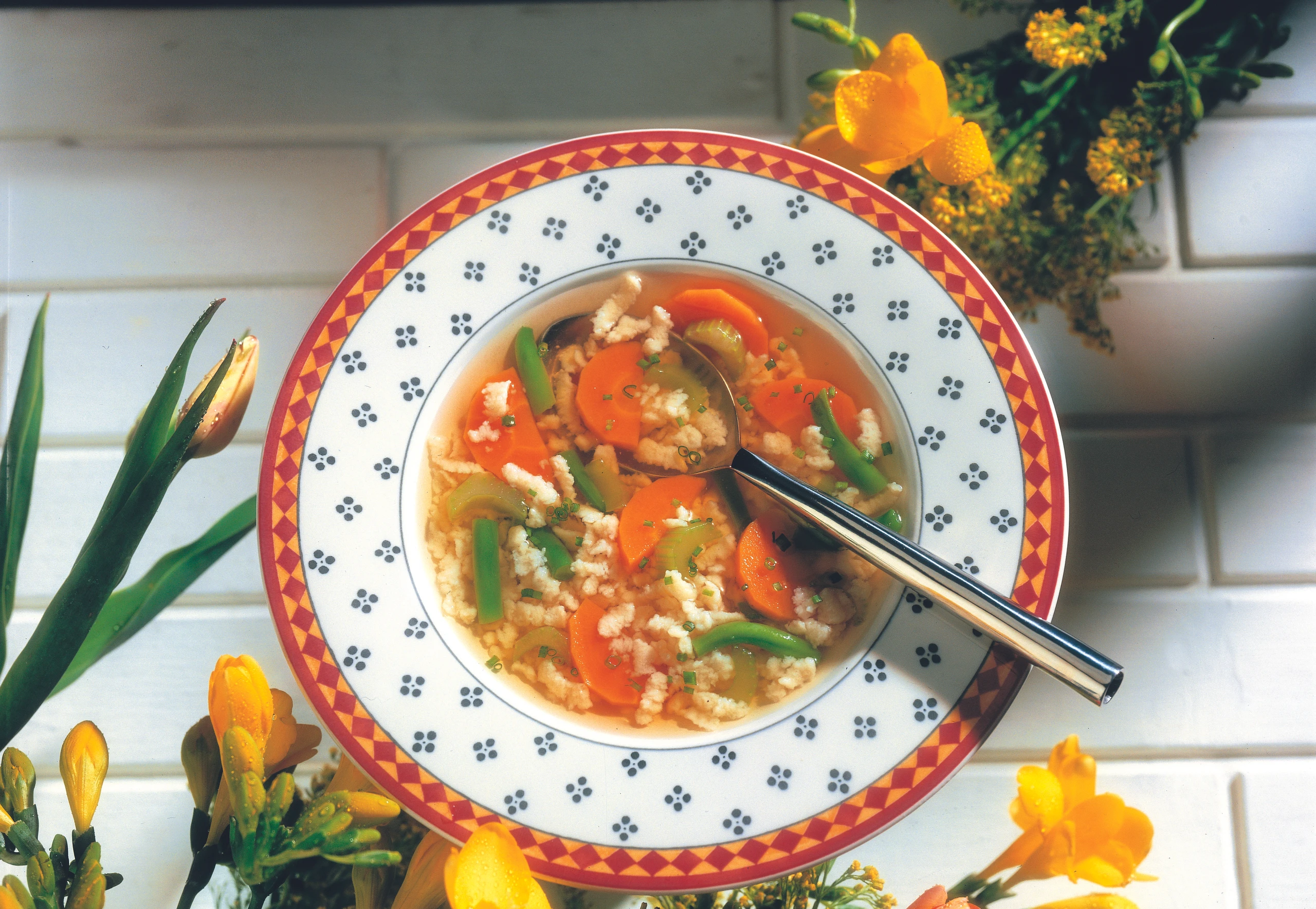 Schnittlauch fein schneiden. Gemüsesuppe aufkochen, Gemüse und Käsegersteln zugeben und darin erwärmen. Suppe in Teller schöpfen und mit Schnittlauch bestreut servieren.