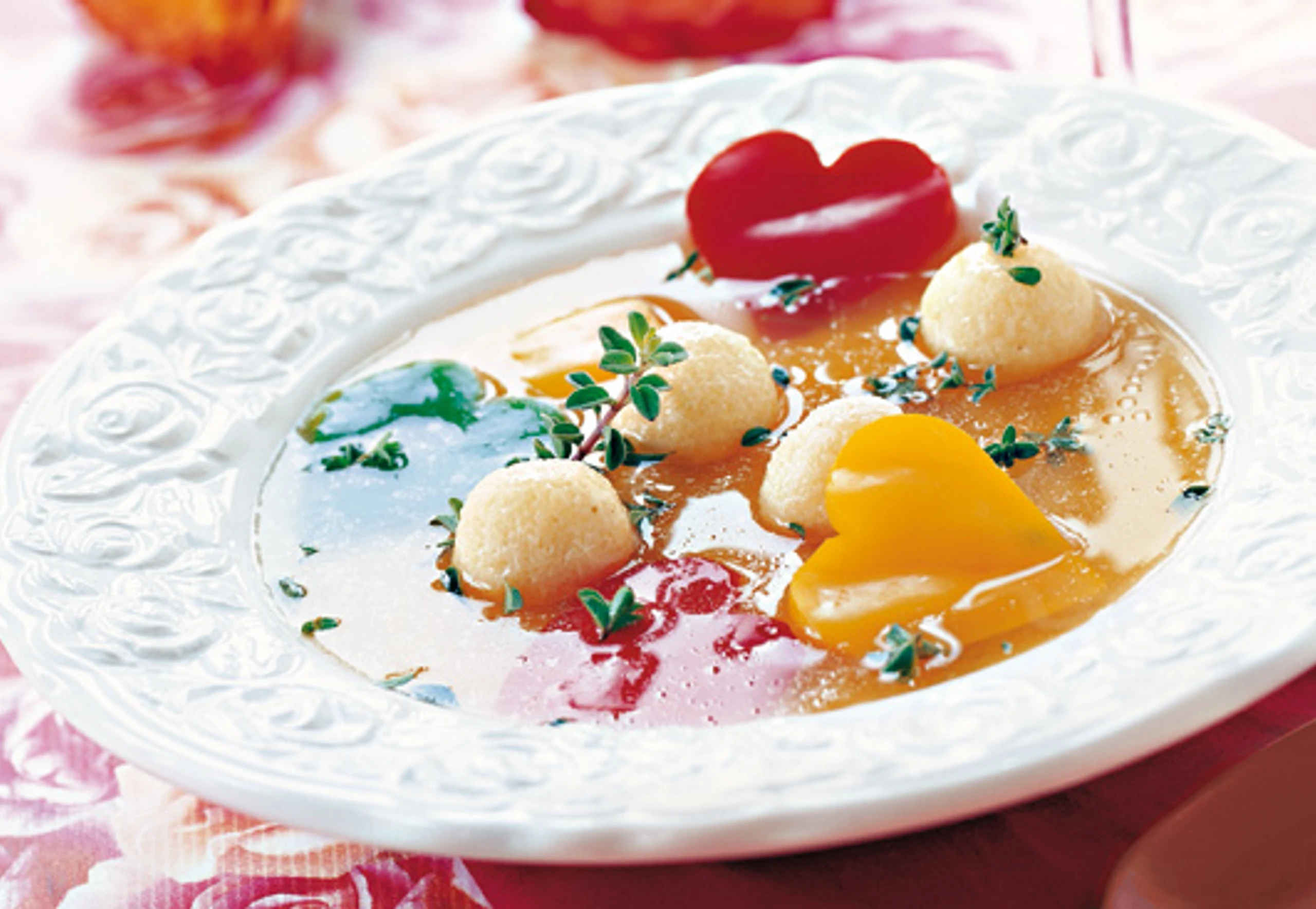 - Knödel aus dem Kochfond heben und abtropfen lassen. Suppe mit den Paprikaherzen und Knödeln anrichten, mit Majoran bestreut servieren.