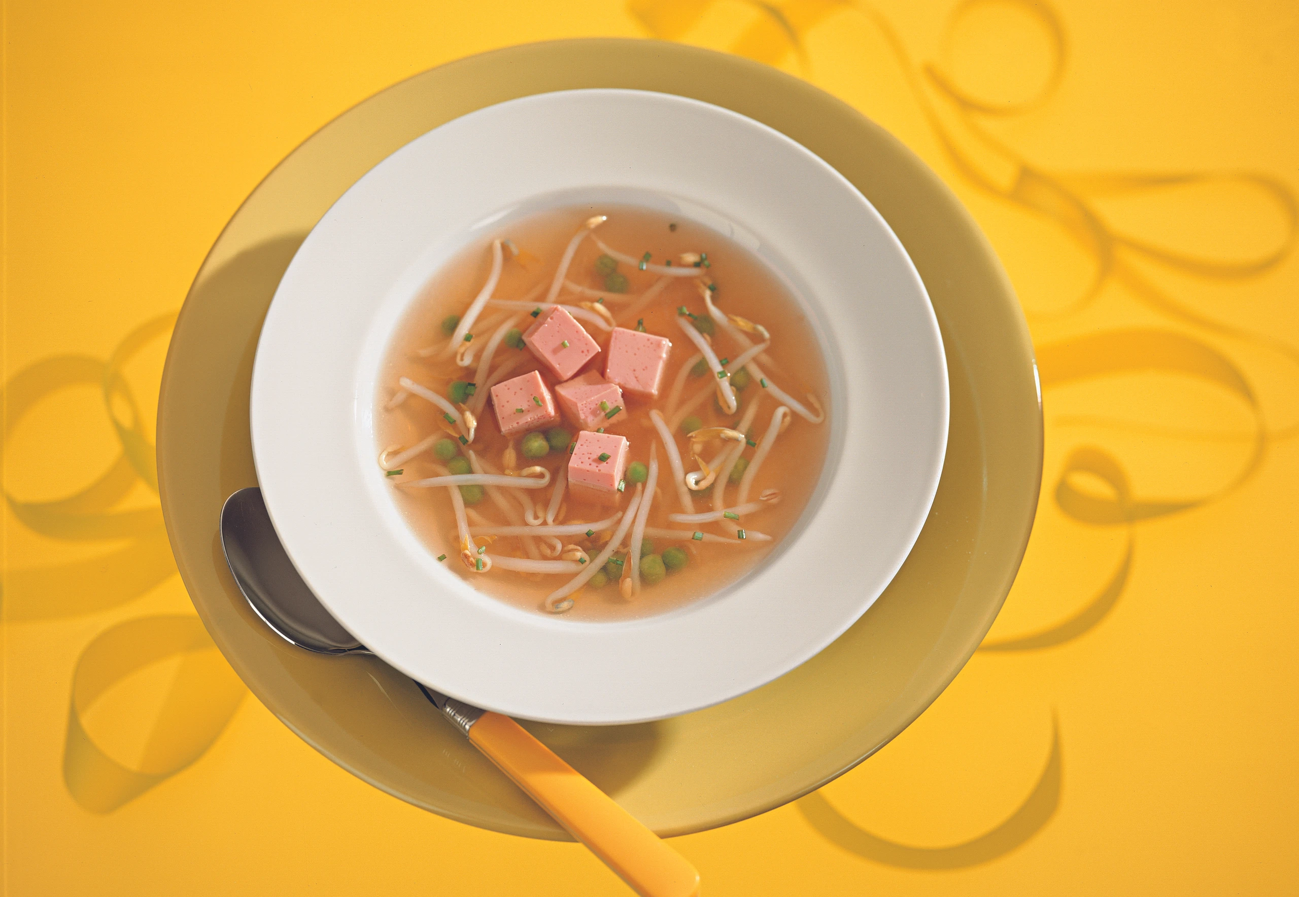 Suppe erhitzen, Sojakeimlinge und Erbsen in die Suppe geben und ca. 5 Minuten schwach köcheln. Eierstich mit der Suppe in Tellern anrichten und mit Schnittlauch bestreut servieren.