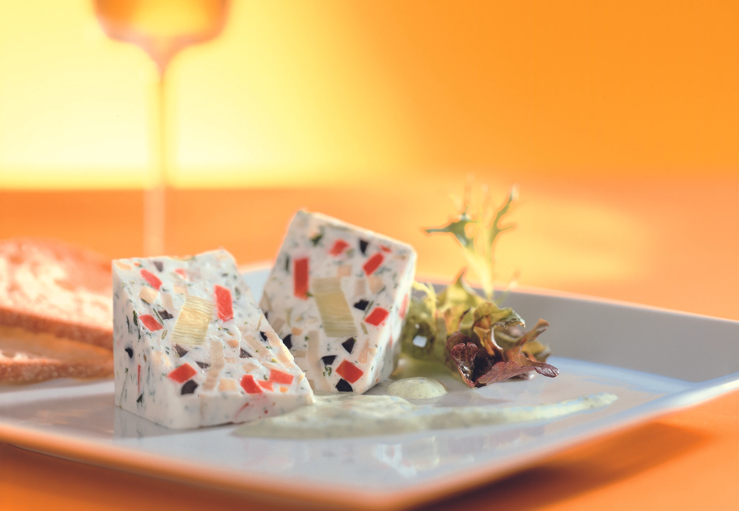 Terrine stürzen, die Folie entfernen und die Terrine in Scheiben schneiden. Mit der Sauce und eventuell mit Blattsalaten anrichten.