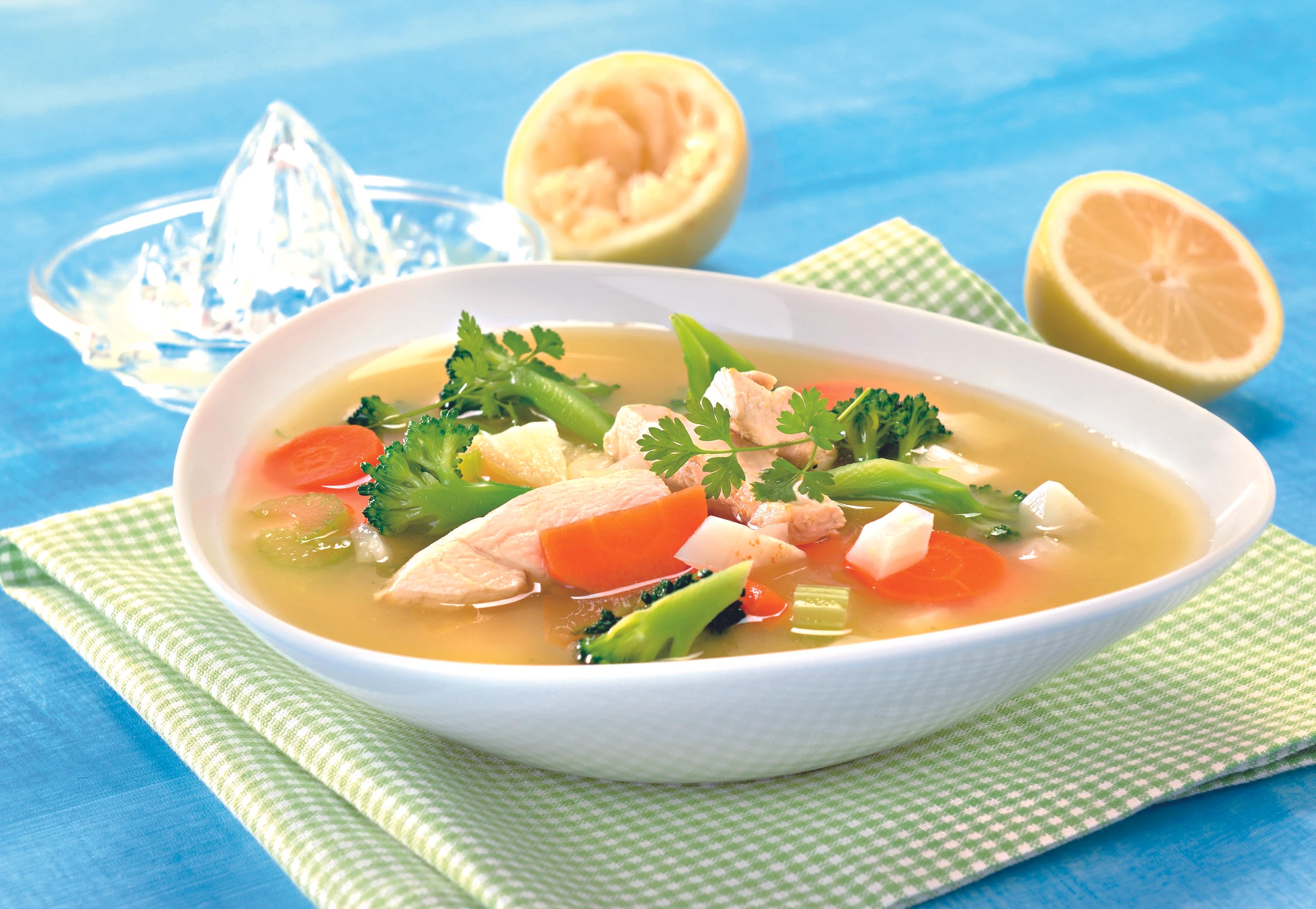 - Brokkoli in sehr kleine Röschen, Hühnerfilet in kleine Stücke schneiden. Beides in den Gemüsetopf geben, zudecken und köcheln, bis das Fleisch gar ist (ca. 5 Minuten). Gemüsetopf mit Zitronensaft, Salz und Pfeffer abschmecken. Kerbel fein schneiden. Gemüsetopf mit Kerbel bestreut anrichten.