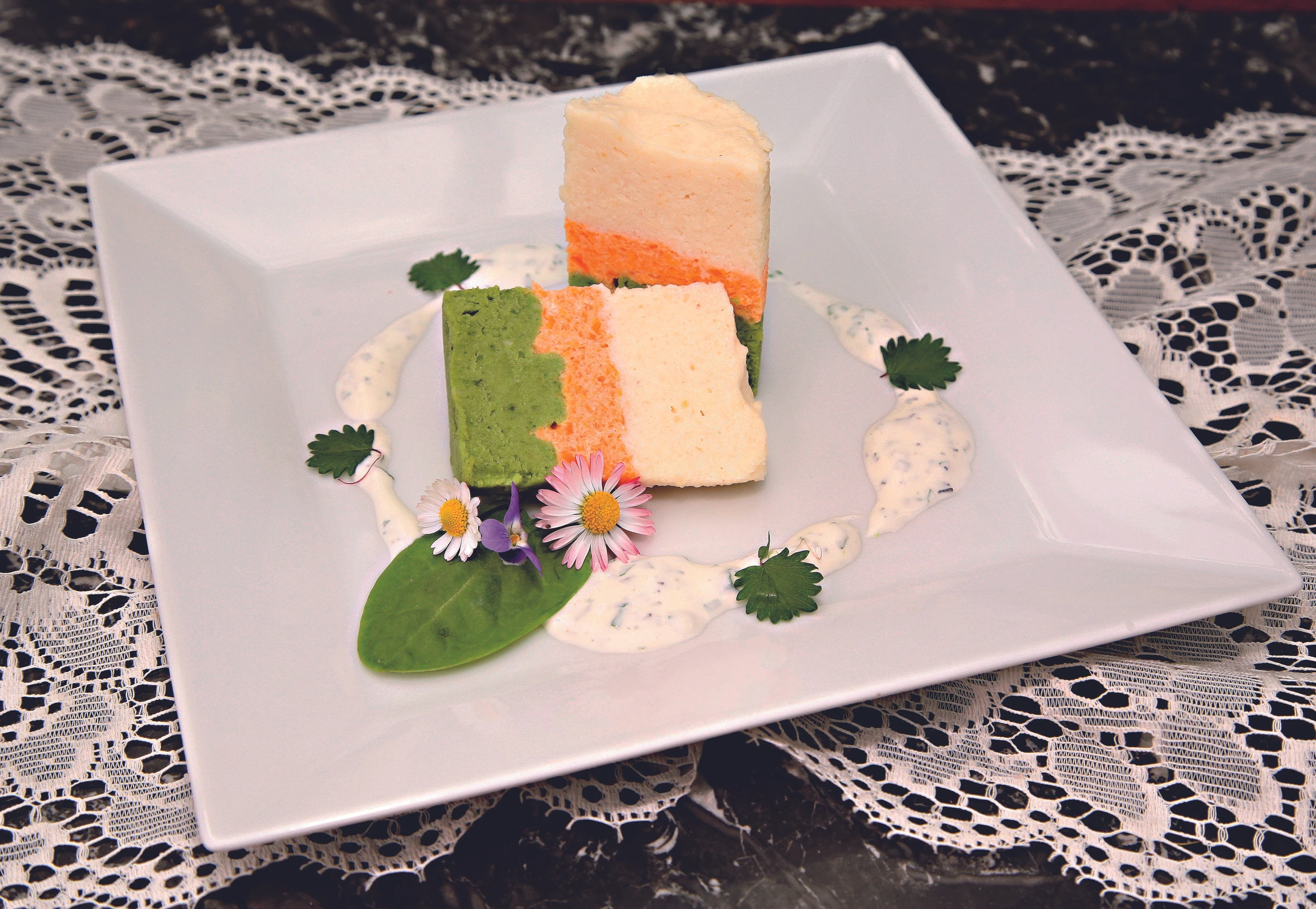 Gelatine in kaltem Wasser einweichen. Obers schlagen. Je 2 Blatt Gelatine gut ausdrücken und in wenig von jedem Gemüsepüree auflösen. Jeweils mit dem übrigen Püree vermischen und abkühlen lassen. Unter jedes Püree ein Drittel vom Obers heben. Pürees mit Salz, Pfeffer und Muskat würzen.