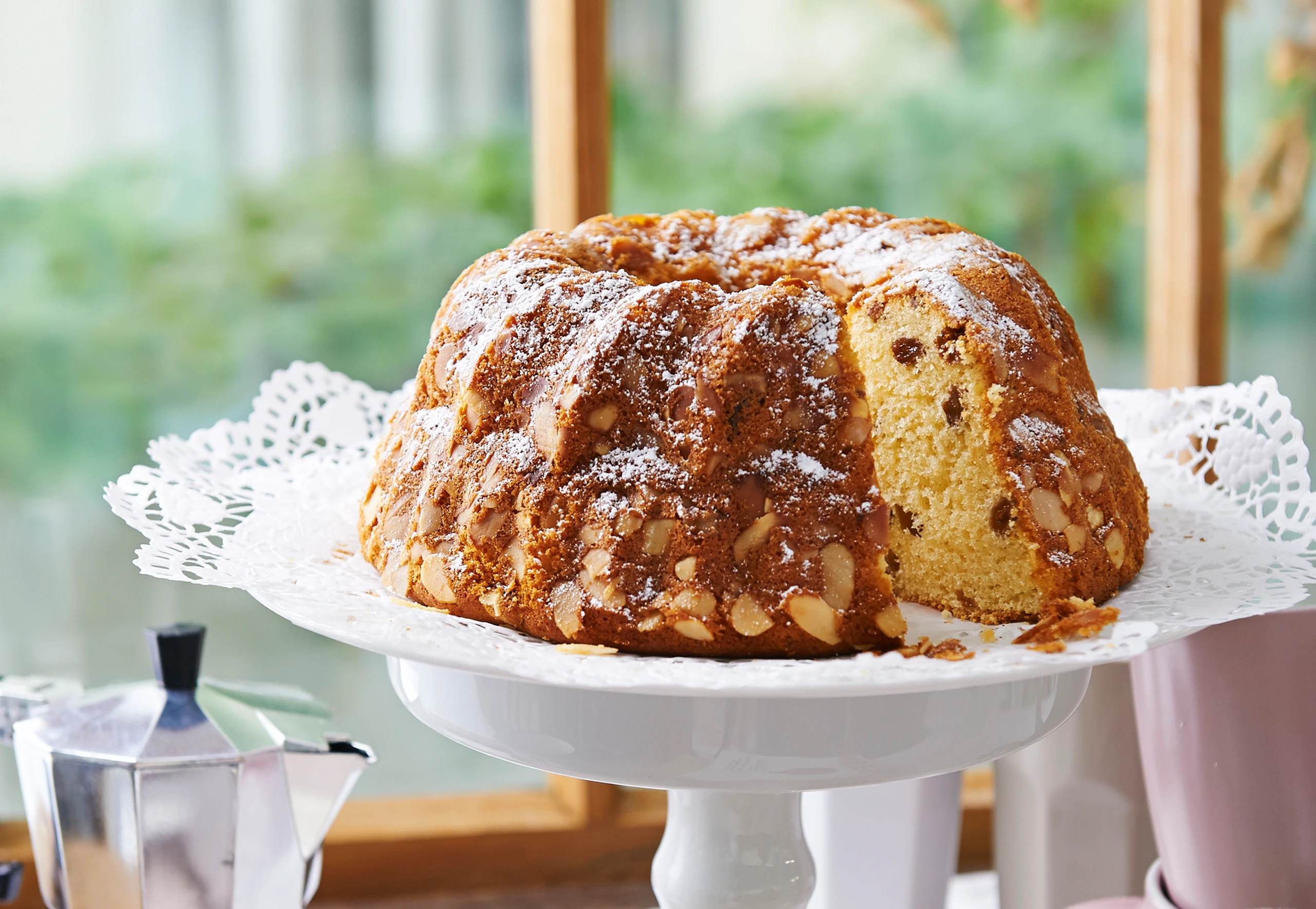 Rosinen im Rum einweichen. Gugelhupfform mit Butter ausstreichen und mit Mandelblättchen ausstreuen.