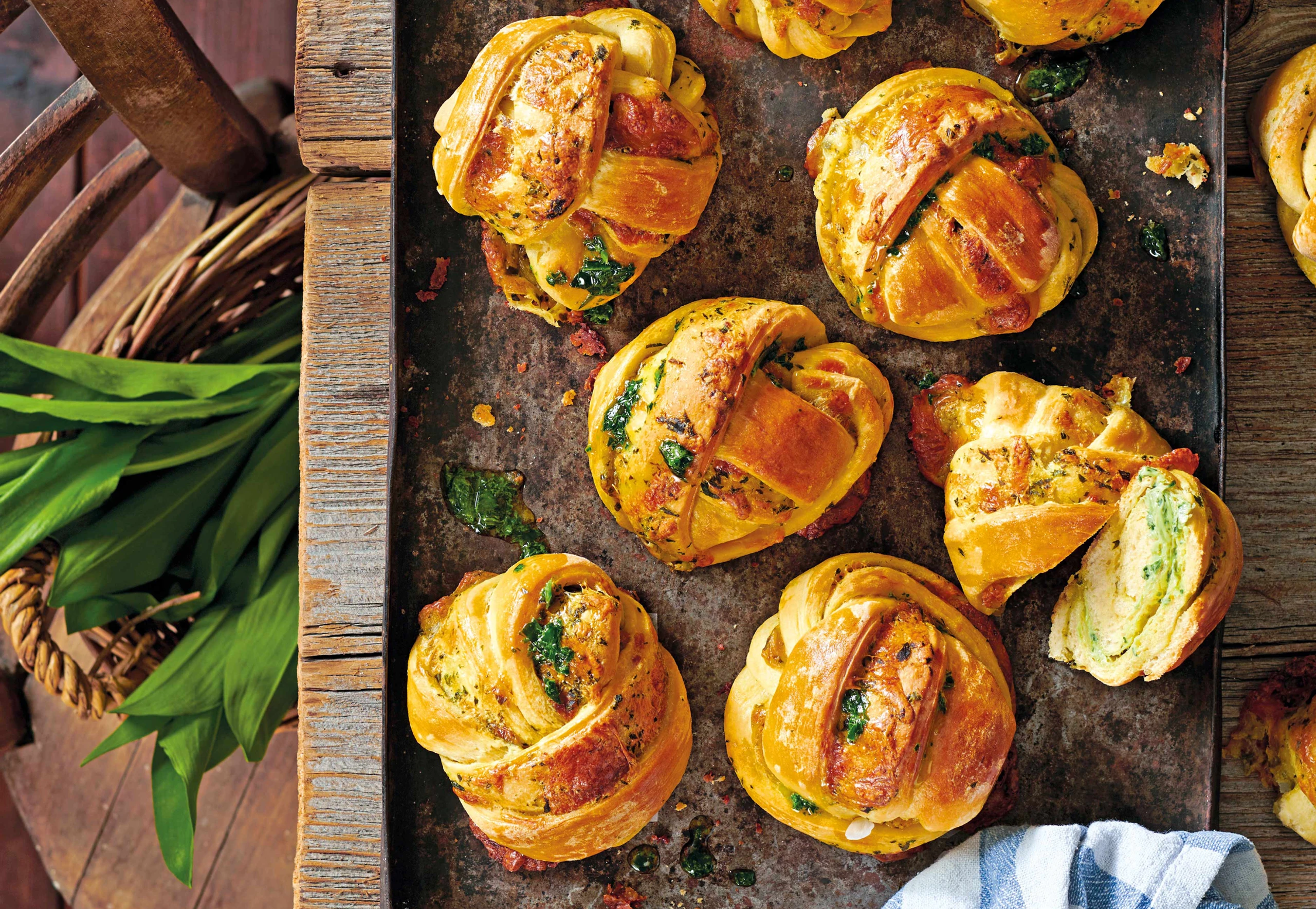 Teig auf einer leicht bemehlten Arbeitsfläche rechteckig ausrollen (ca. 34 x 28 cm) und mit der Bärlauchbutter bestreichen. Teig in der Mitte zusammenklappen, sodass eine Fläche von ca. 34 x 14 cm entsteht. In 14 gleich dicke Streifenschneiden. Streifen locker und überlappend über 2 Finger wickeln. Enden in die Mitte stecken. Knoten auf das Blech legen. Ei verquirlen, Knoten damit bepinseln und ca. 15 Minuten rasten lassen.