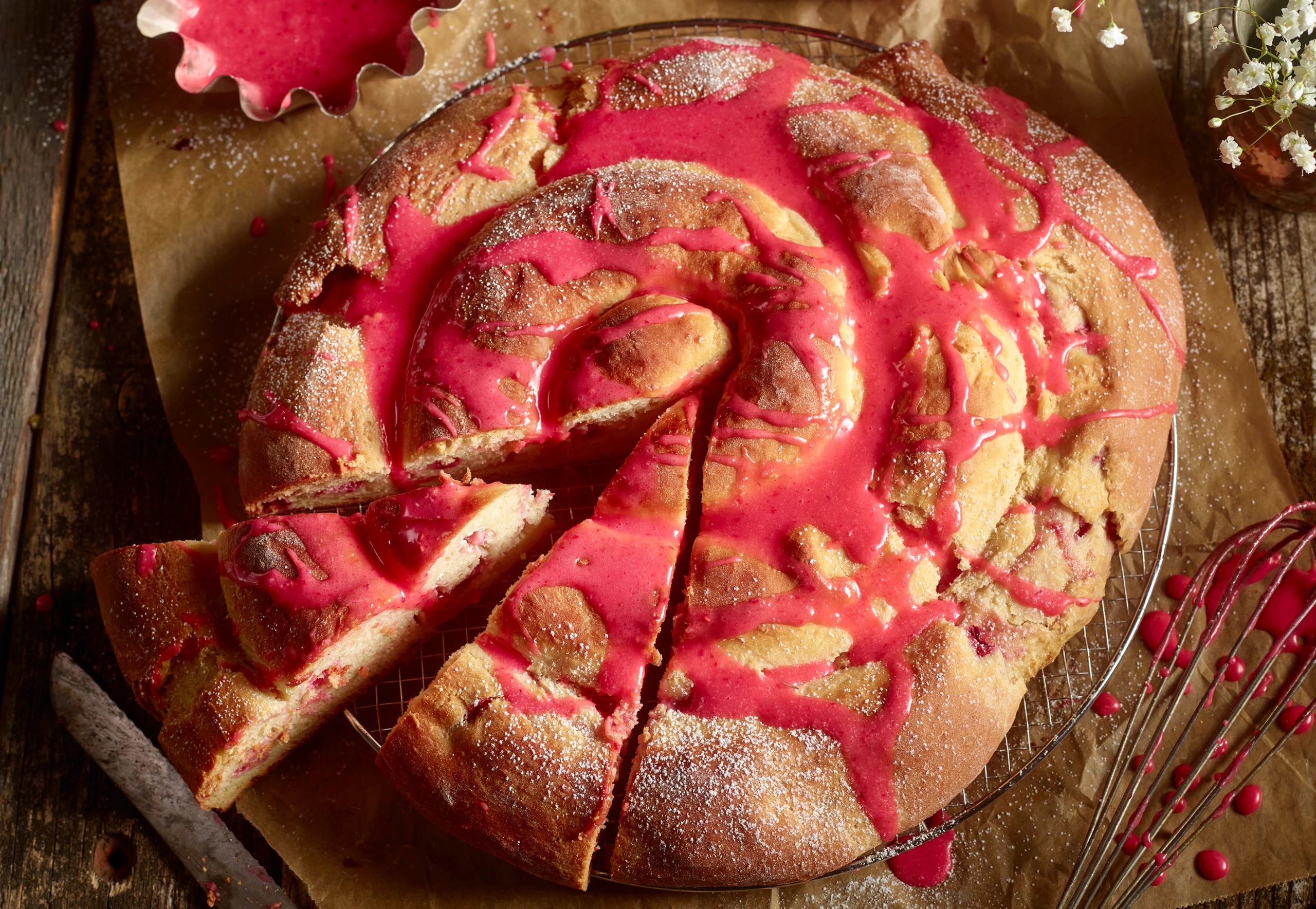 Für die Glasur Erdbeeren mit einer Gabel zerdrücken und mit dem Staubzucker verrühren. Schnecke mit der Glasur beträufeln.