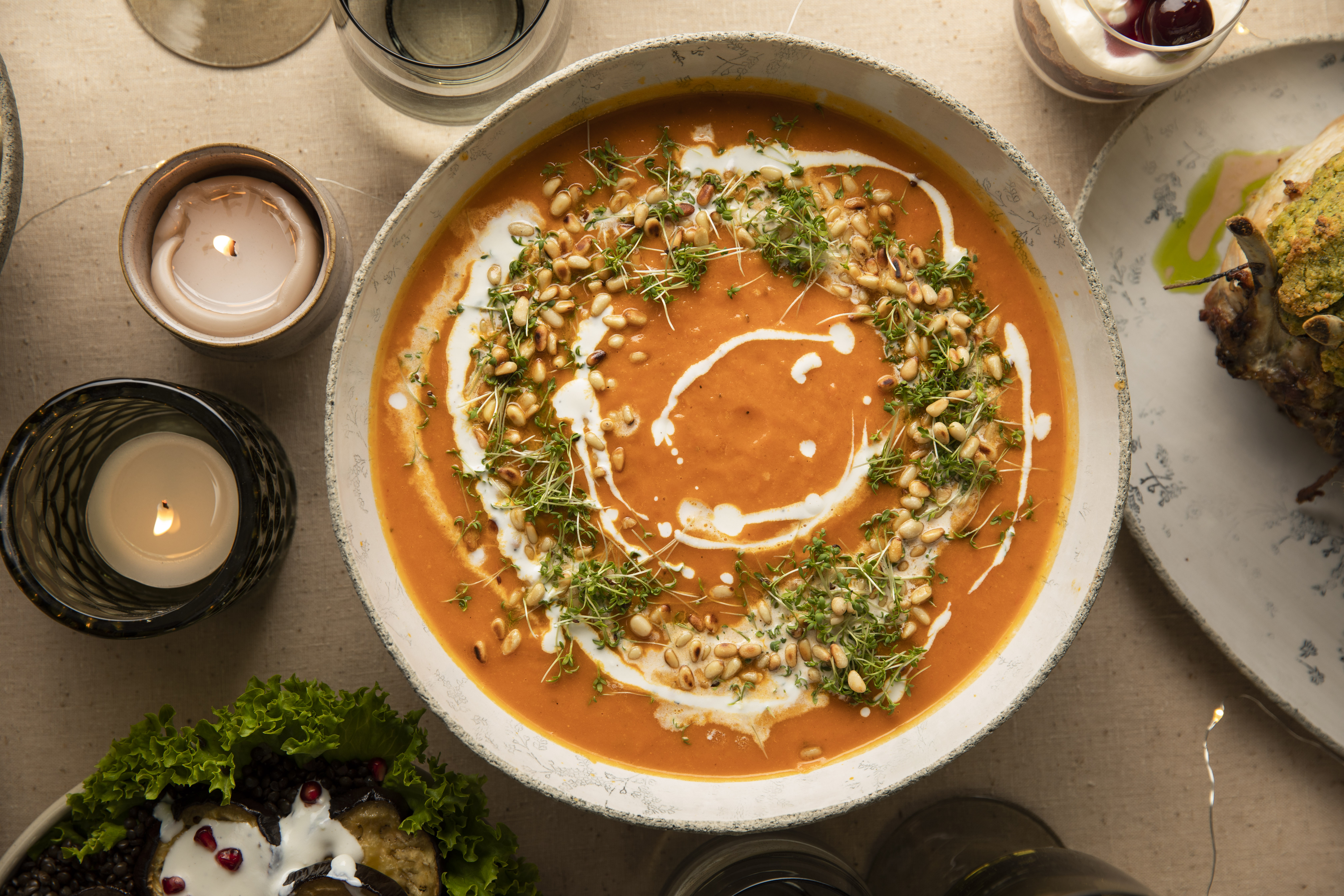 Herausnehmen und in einen Topf geben. Suppe und 150 ml von der Kokosmilch zugeben. Alles fein pürieren und aufkochen. Suppe mit restlicher Kokosmilch beträufeln und mit Pignoli und Kresse bestreuen.
