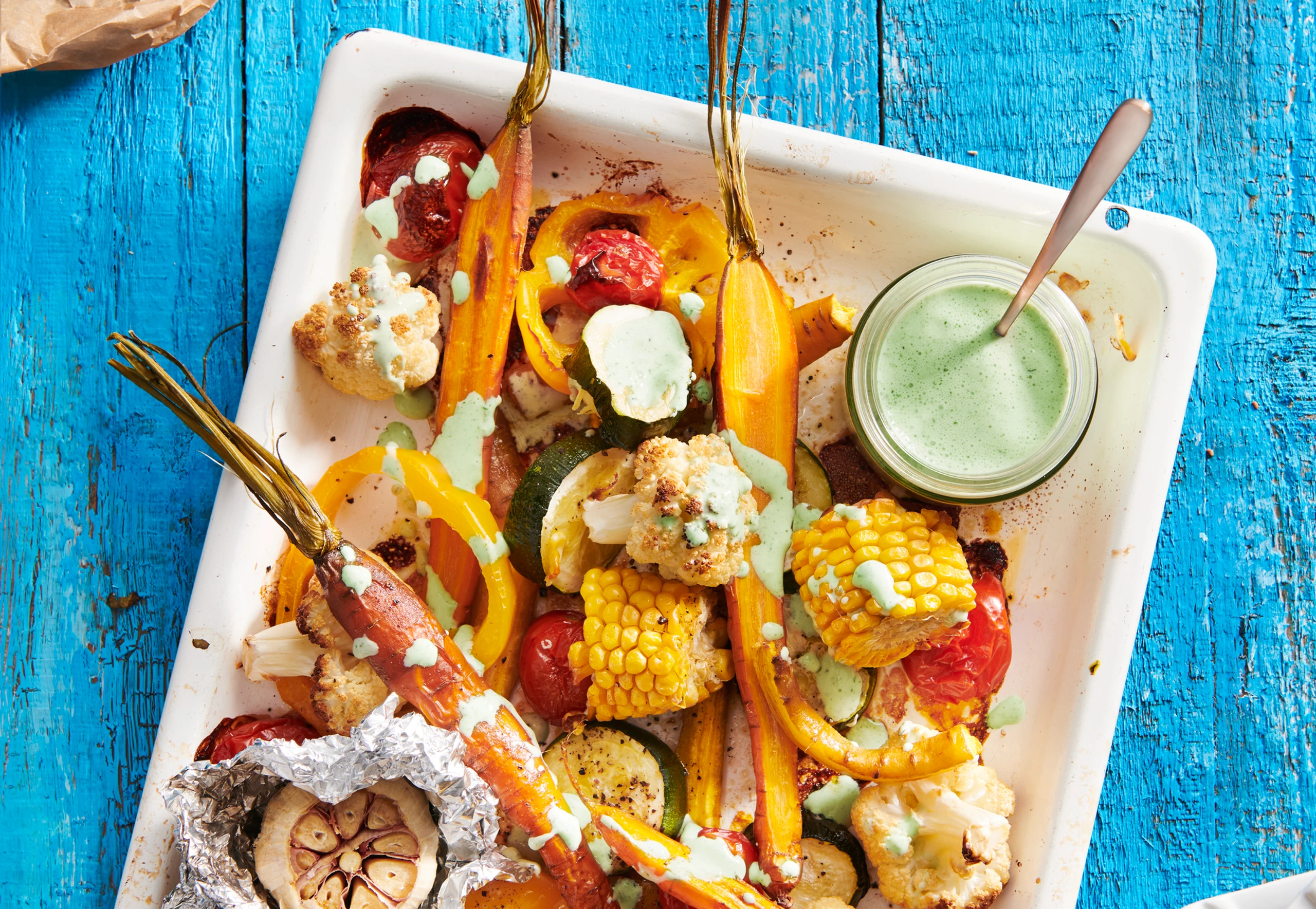 Für das Dressing alle Zutaten pürieren und mit Salz und Pfeffer abschmecken. Zum Servieren über das Gemüse träufeln.