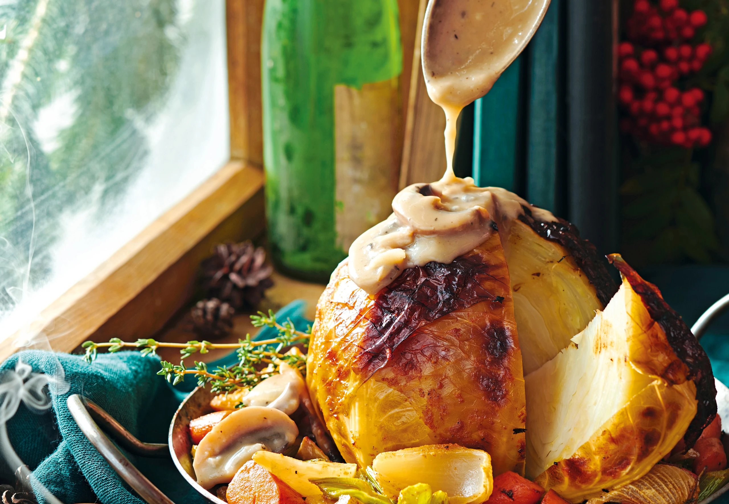 Für die Sauce Zwiebel schälen und klein würfeln. Champignons putzen und blättrig schneiden. Beides in der Butter anschwitzen. Mehl unterrühren und kurz mitrösten. Mit Suppe aufgießen und ca. 5 Minuten köcheln. Sauce mit Salz und Pfeffer abschmecken. Petersilie untermischen. Krautkopf mit Gemüse und Schwammerlsauce servieren.