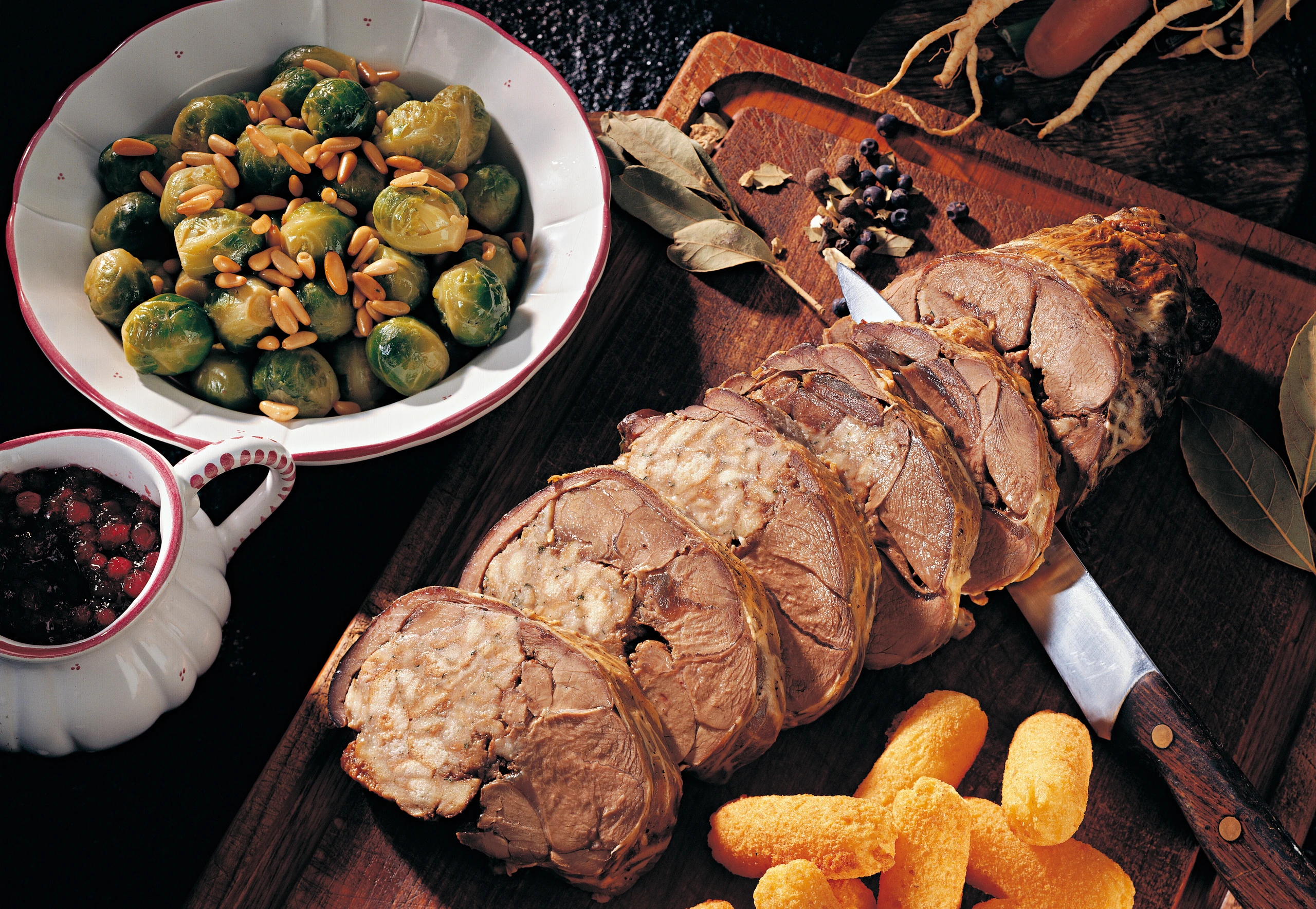 Gerollte Hirschschulter mit Maroni-Semmelfülle