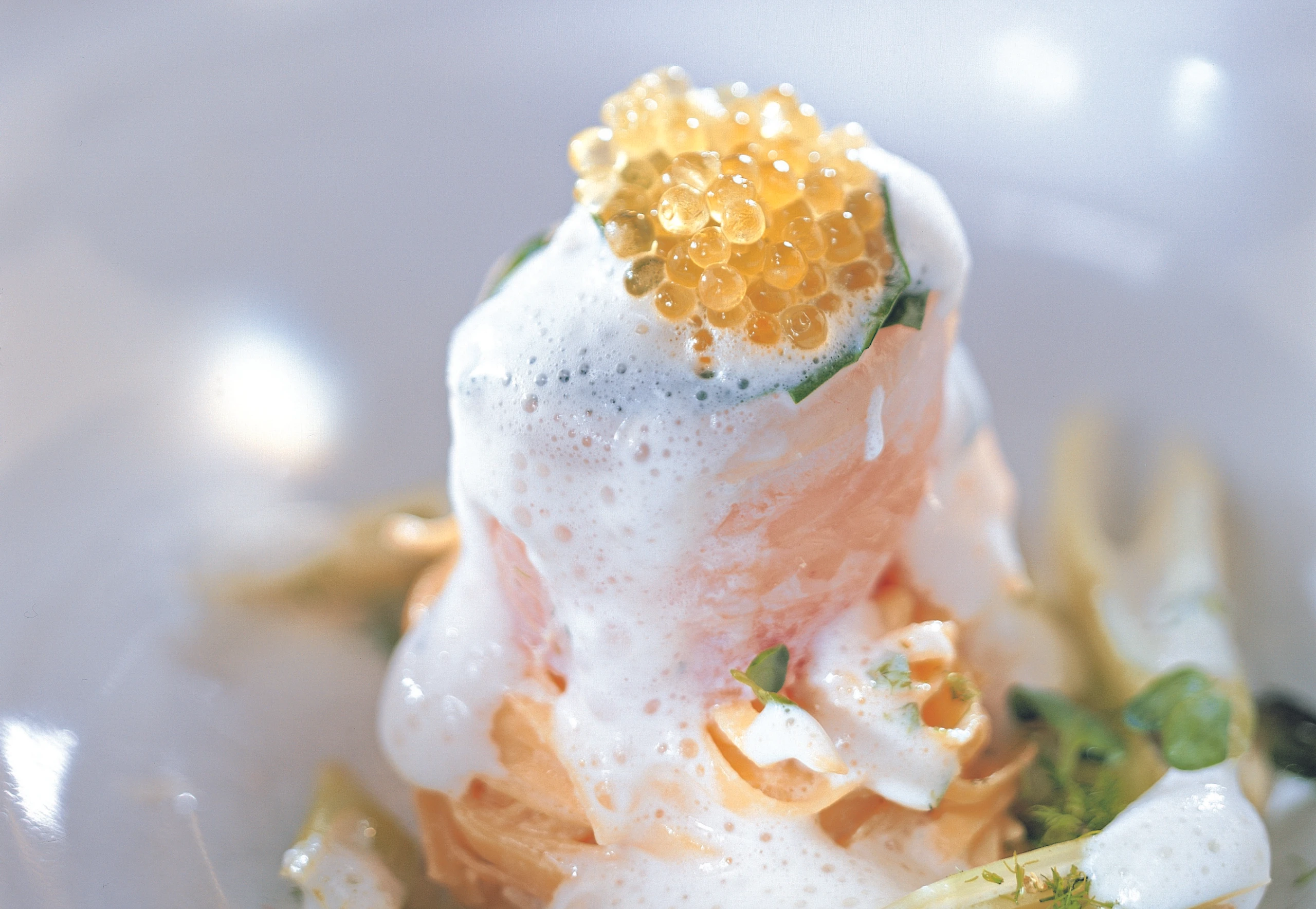 Fenchel, darauf Nudeln, Seezunge, Kresse anrichten, mit aufgeschäumter Sauce und Kaviar vollenden.