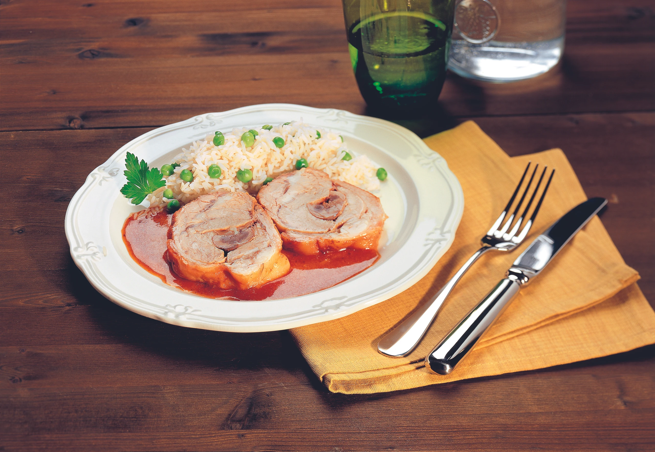 Gerollter Kalbsnierenbraten mit Erbsenreis