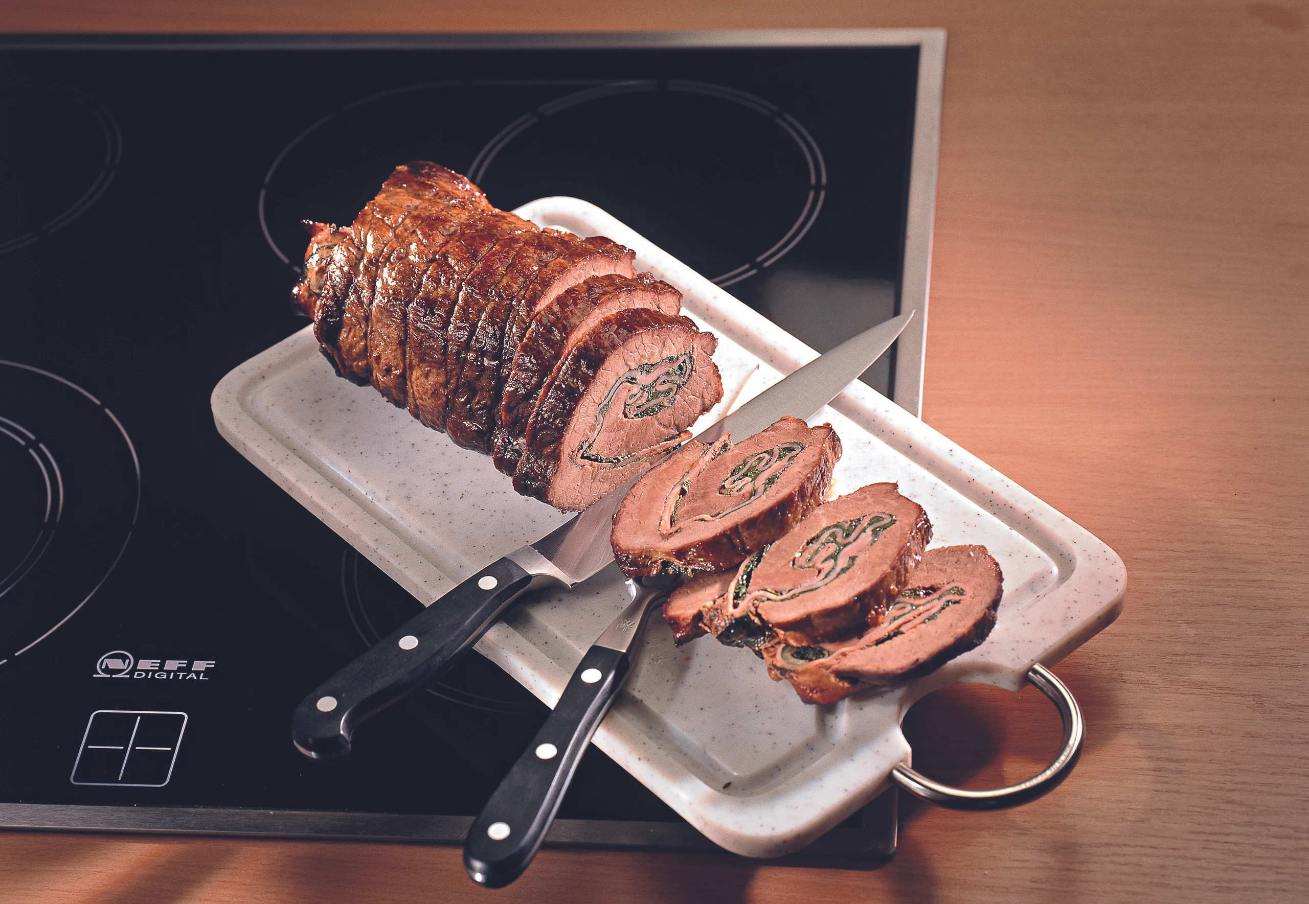 - Fleischstück im unteren Drittel von der linken Seite bis knapp an das Ende einschneiden. Anschließend im oberen Drittel von rechts einschneiden. Fleisch aufklappen, mit Frischhaltefolie belegen und behutsam klopfen. Backrohr auf 180 °C vorheizen.