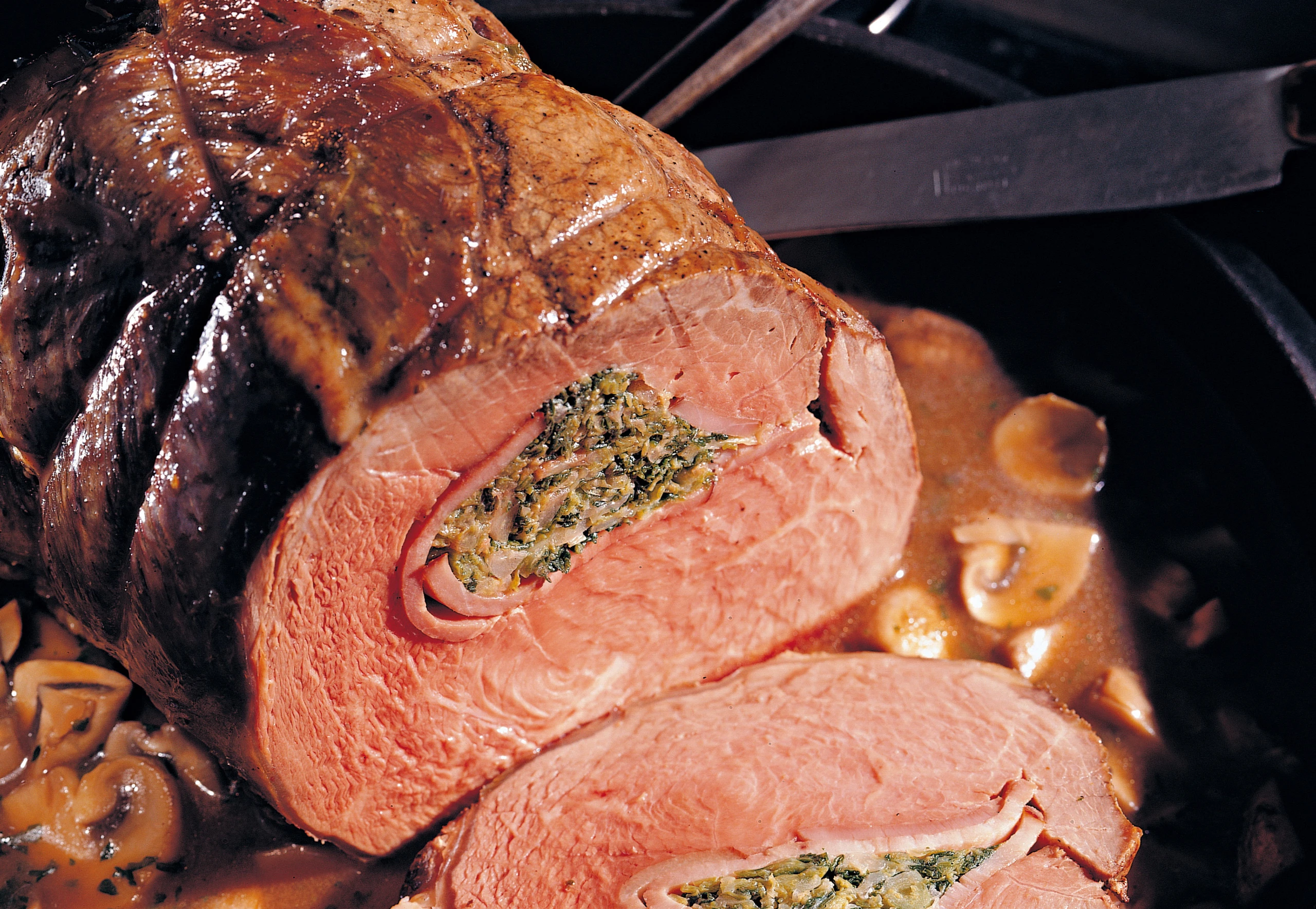 Das Fleisch mit Salz, Pfeffer und Thymian würzen, mit Speckscheiben belegen und mit der Kohlfülle gleichmäßig bestreichen. Fleisch straff einrollen, mit Spagat binden und nochmals mit Salz, Pfeffer und Thymian würzen.