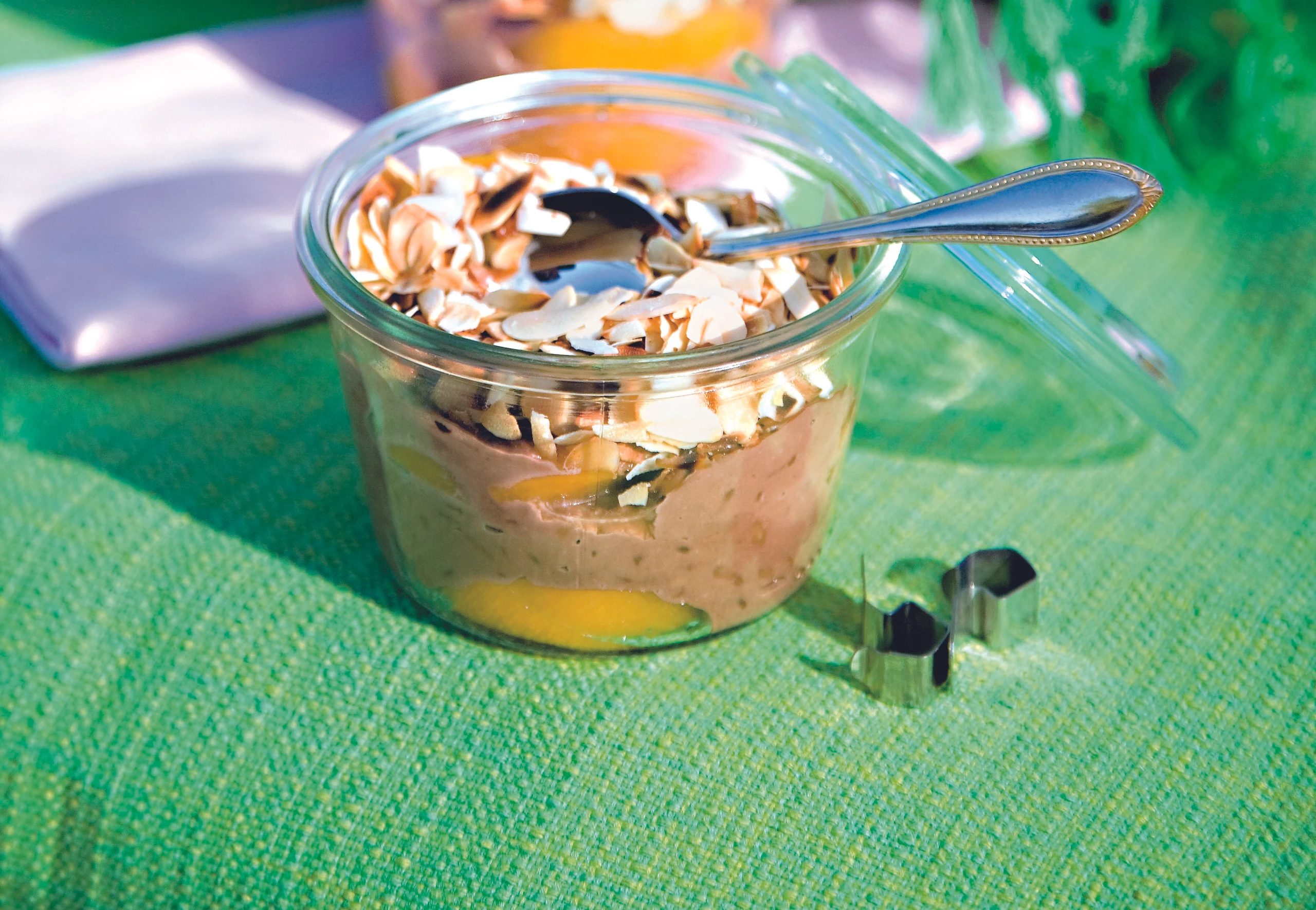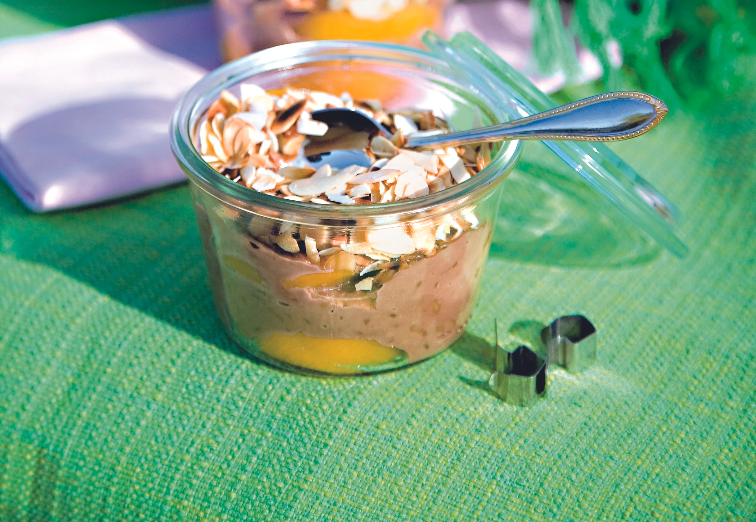 Das Dessert vor dem Servieren bzw. „Einpacken“ mit Mandelblättchen bestreuen.