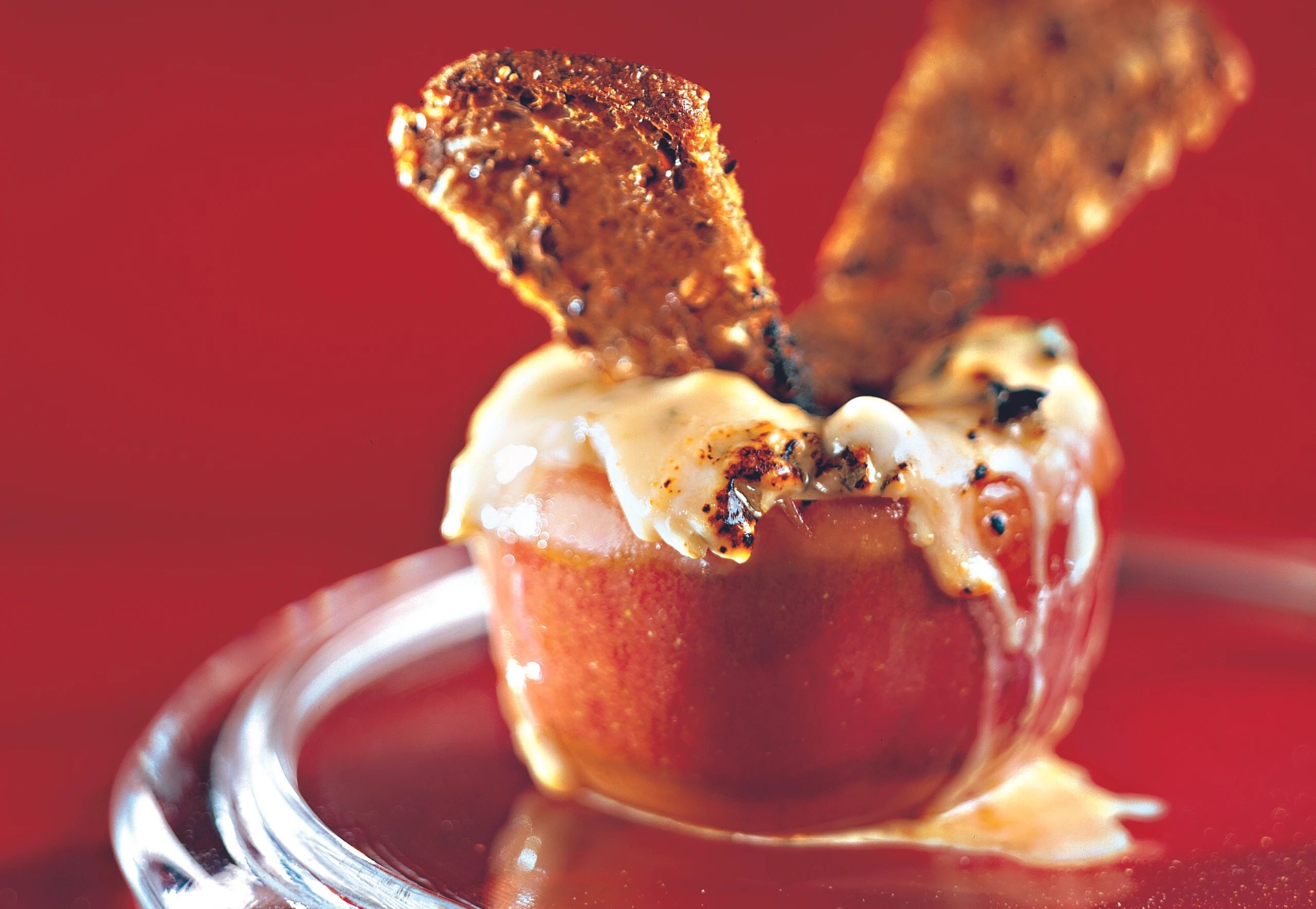 Äpfel (Öffnung oben) in die Form setzen und mit der Trockenbeerenauslese füllen. Käse in Scheiben schneiden, Äpfel damit belegen. Äpfel im Rohr (untere Schiene / Gitterrost) ca. 30 Minuten backen. Dazu serviert man getoastetes Schwarzbrot.