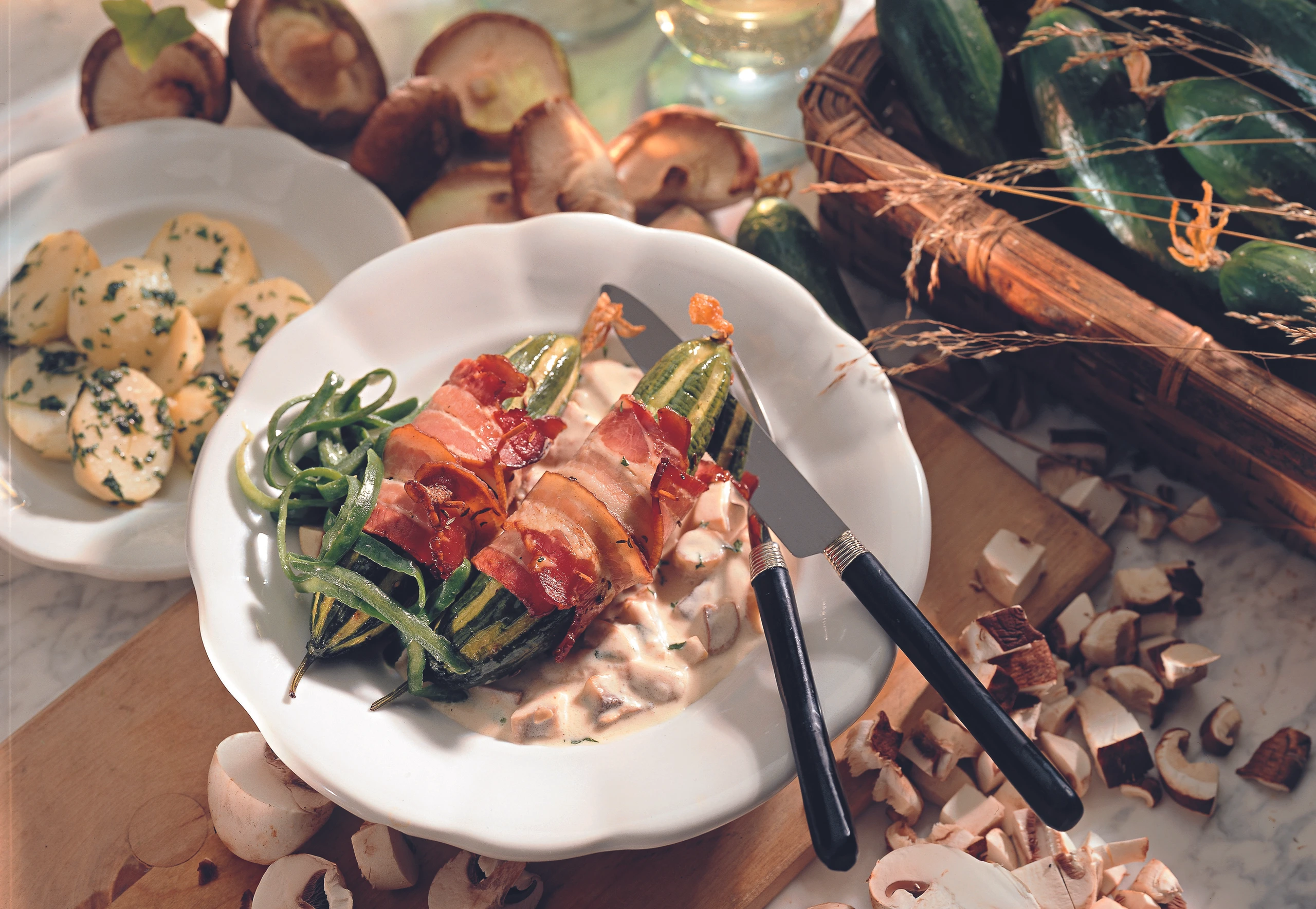 Geschmorte Gurken im Speckmantel