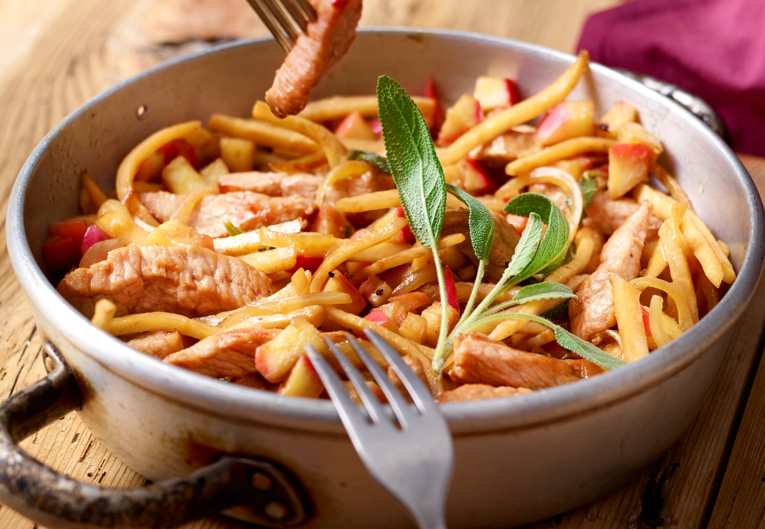 Fleisch mit Salz und Pfeffer würzen und in 4 EL Olivenöl anbraten. Zwiebel- und Selleriestreifen zugeben und bissfest garen. Apfelstücke unterrühren und alles zusammen schmoren lassen. Fleisch-Gemüsemischung mit Butter und Salbei verfeinern, mit Salz und Pfeffer würzen.