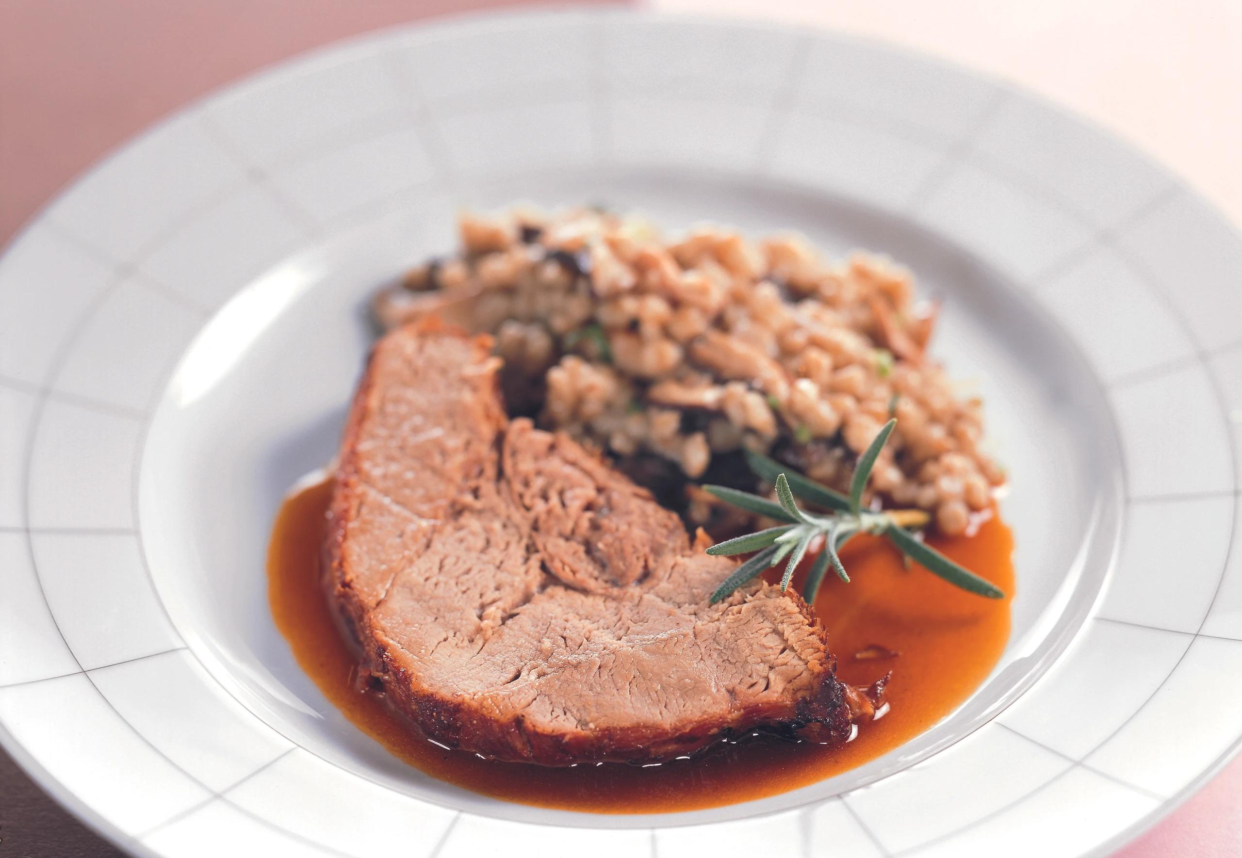 Für die Sauce Butter und Mehl verrühren. Fleisch aus der Form nehmen, Saft abseihen, aufkochen und durch Einrühren der Mehlbutter binden. Sauce kurz kochen. Fleisch am besten mit einem Elektromesser aufschneiden und mit der Sauce und dem Schwammerl-Rollgerstl anrichten.